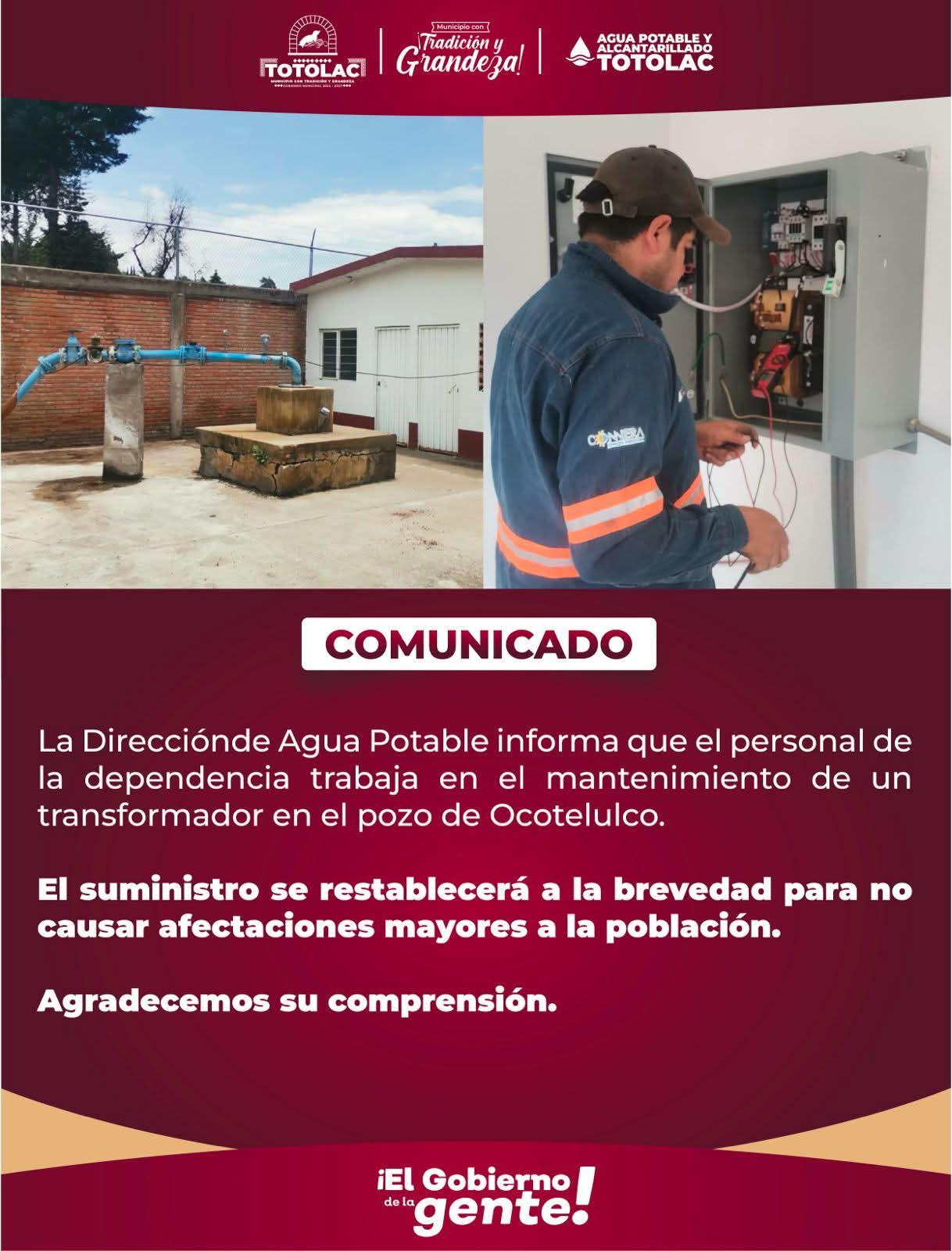 La Dirección de Agua Potable informa que trabaja en el mantenimiento de un transformador en el pozo de Ocltelulco. El suministro se restablecerá a la brevedad