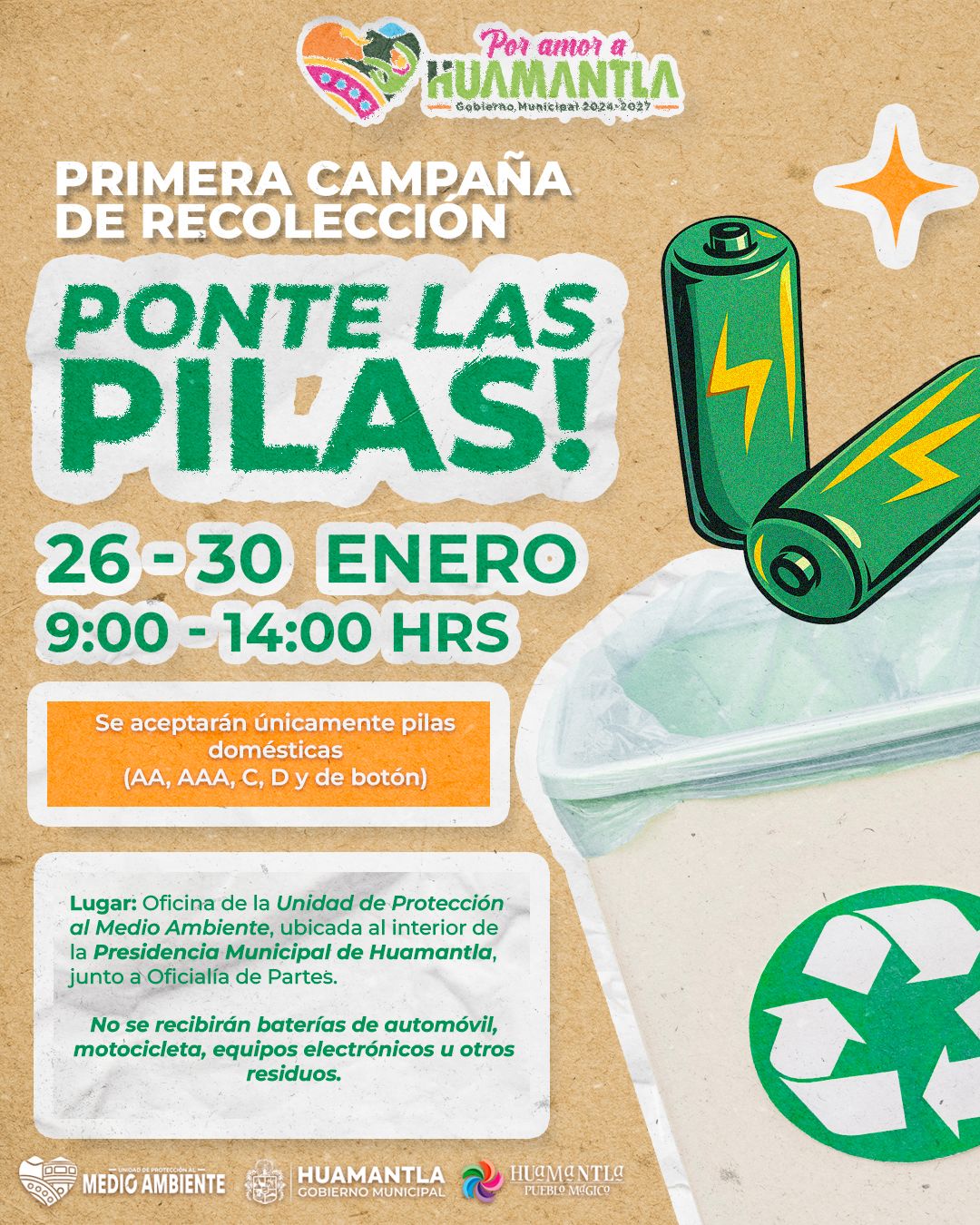 Con el objetivo de fomentar el cuidado del medio ambiente y prevenir la contaminación del suelo y el agua, el Gobierno Municipal de Huamantla, a través de la Unidad de Protección al Medio Ambiente, invita a la ciudadanía a participar en la Primera Campaña de Recolección de Pilas Usadas “Ponte las Pilas”.