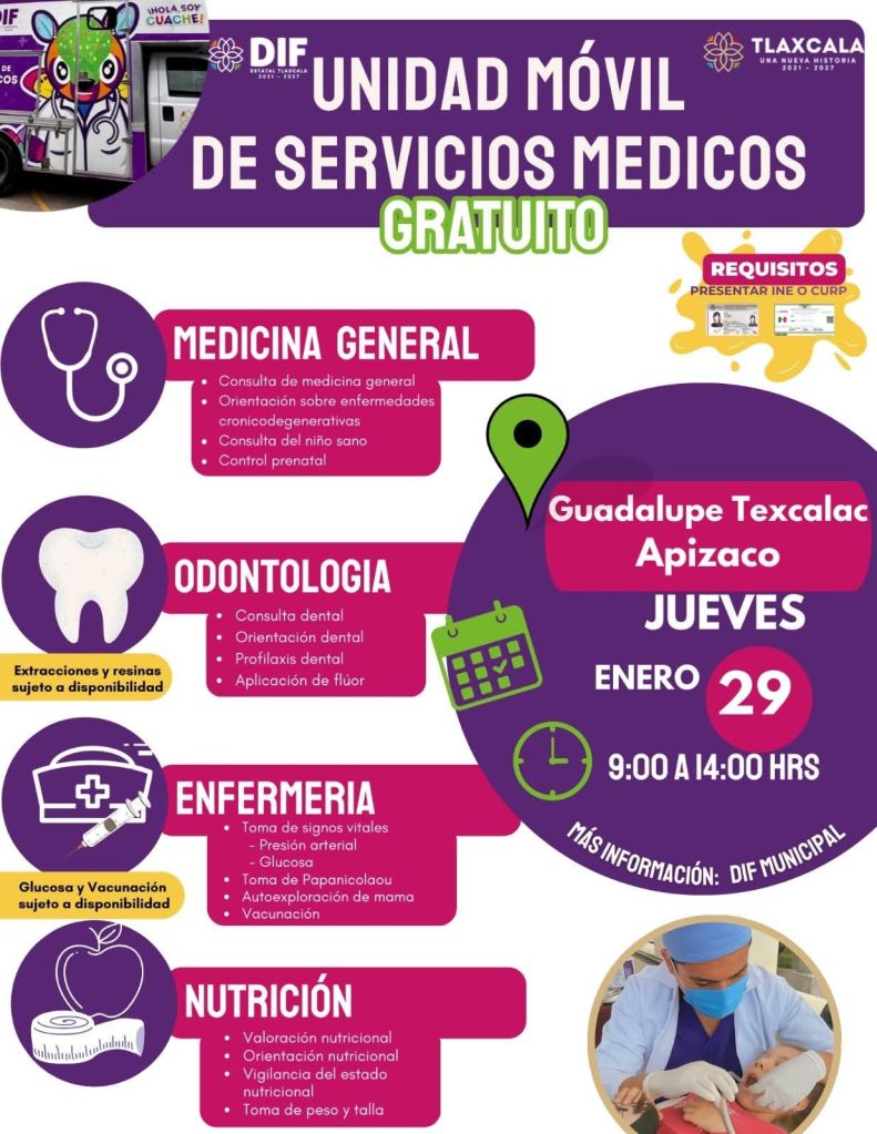El Gobierno de Apizaco, en coordinación con el DIF Estatal Tlaxcala, acerca a la ciudadanía la Unidad Móvil de Servicios Médicos, con atención totalmente gratuita para niñas, niños, jóvenes y personas adultas.