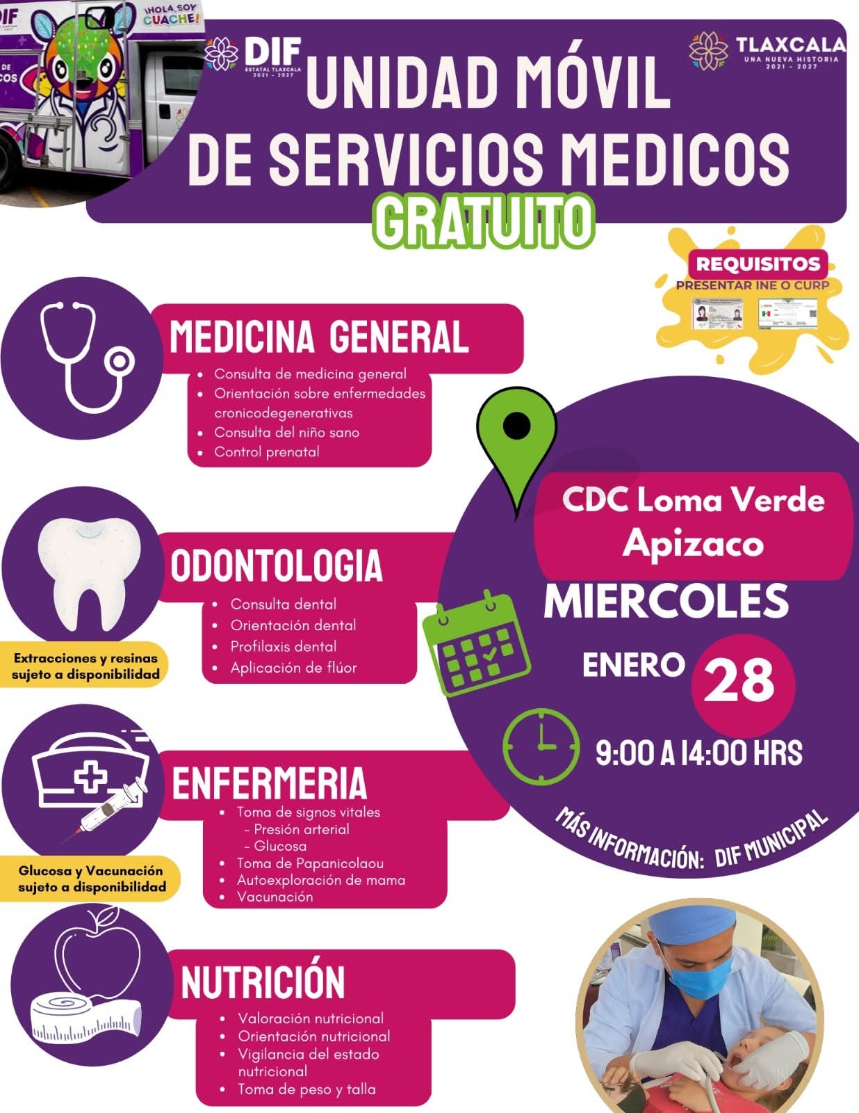 El Gobierno de Apizaco, en coordinación con el DIF Estatal Tlaxcala, acerca a la ciudadanía la Unidad Móvil de Servicios Médicos, con atención totalmente gratuita para niñas, niños, jóvenes y personas adultas.