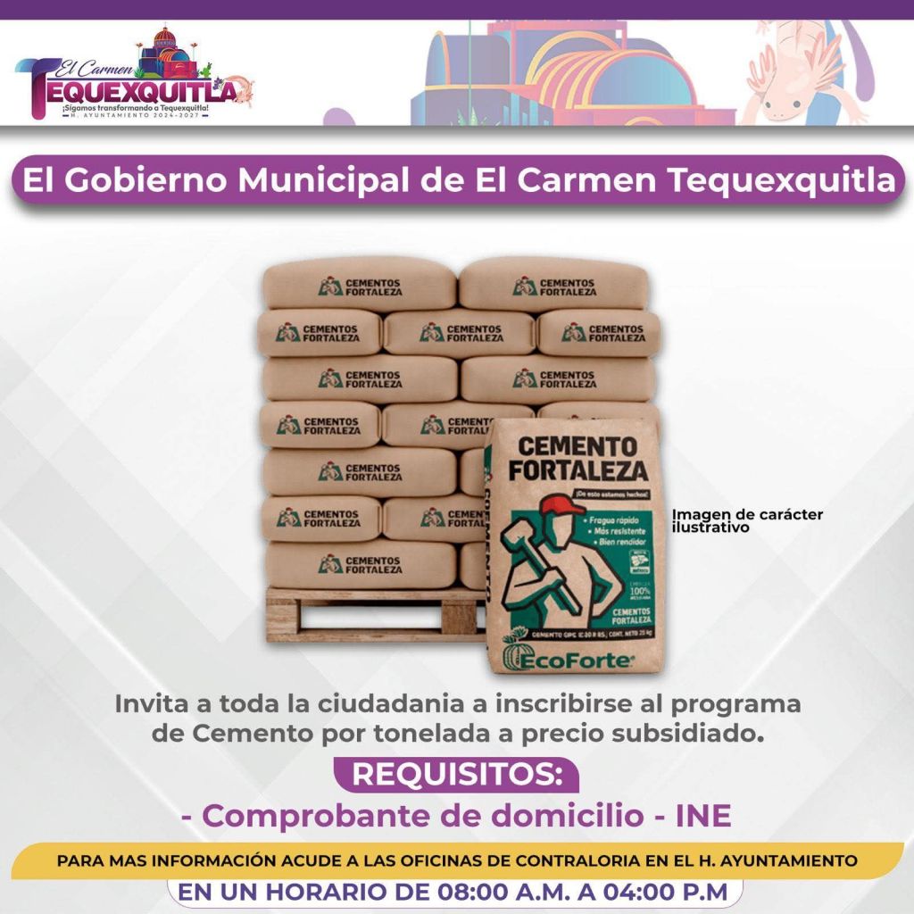 El Gobierno Municipal de El Carmen Tequexquitla invita a la ciudadanía a inscribirse al programa de Cemento por tonelada a precio subsidiado, con el objetivo de apoyar la economía de las familias y contribuir al mejoramiento de sus viviendas. 🧱
