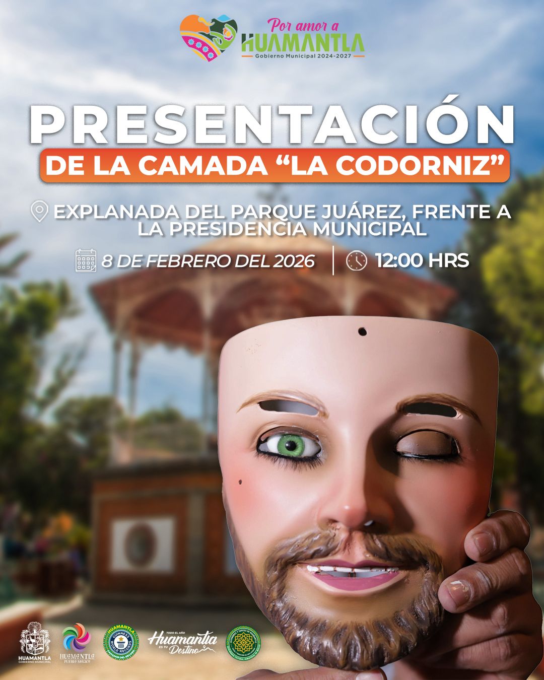 El Gobierno Municipal de Huamantla invita a la ciudadanía a ser testigos de la presentación de la camada de huehues “La Codorniz”, una de las expresiones más representativas del Carnaval tlaxcalteca, que se llevará a cabo este domingo 8 de febrero de 2026 a las 12:00 horas, en la explanada del Parque Juárez, frente a la Presidencia Municipal.
