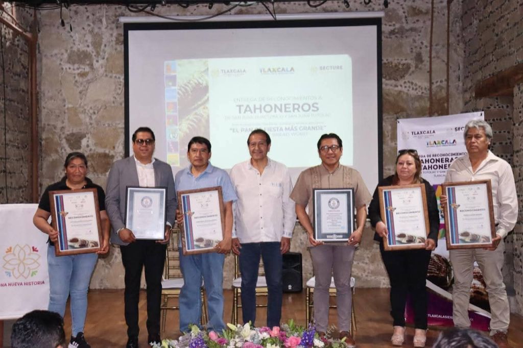 El Secretario de Turismo, 𝗙𝗮𝗯𝗿𝗶𝗰𝗶𝗼 𝗠𝗲𝗻𝗮 𝗥𝗼𝗱𝗿í𝗴𝘂𝗲𝘇, entregó reconocimientos a los municipios de Totolac y San Juan Huactzinco por su 𝗱𝗲𝘀𝘁𝗮𝗰𝗮𝗱𝗮 𝗽𝗮𝗿𝘁𝗶𝗰𝗶𝗽𝗮𝗰𝗶ó𝗻 𝗲𝗻 𝗲𝗹 𝗥é𝗰𝗼𝗿𝗱 𝗚𝘂𝗶𝗻𝗻𝗲𝘀𝘀 de las letras más grandes hechas con pan de fiesta, una hazaña que resalta la tradición panadera tlaxcalteca a nivel mundial.