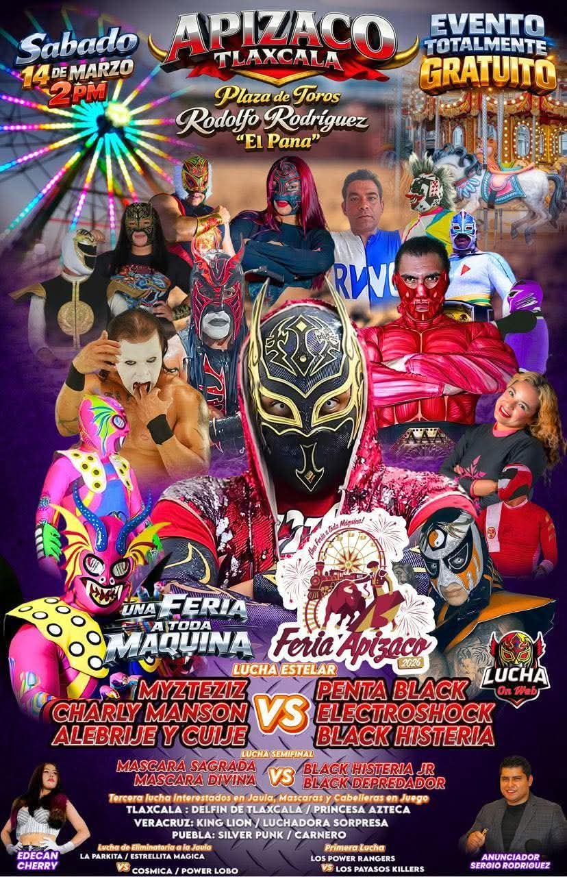 Vive una tarde espectacular con una cartelera de alto nivel encabezada por figuras como Myzteziz, Penta Black, Electroshock, Black Histeria y muchas estrellas más que encenderán el cuadrilátero.