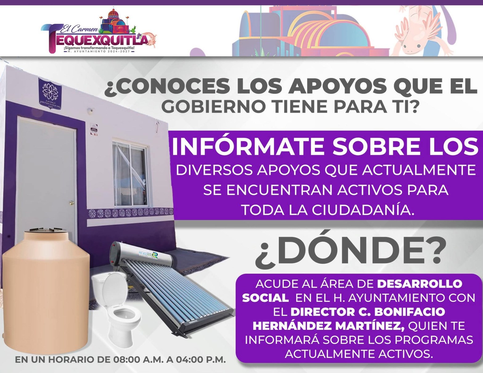 🏛️ Te invitamos a acudir al área de Desarrollo Social en el H. Ayuntamiento, donde el director C. Bonifacio Hernández Martínez te brindará información y orientación sobre los programas vigentes.