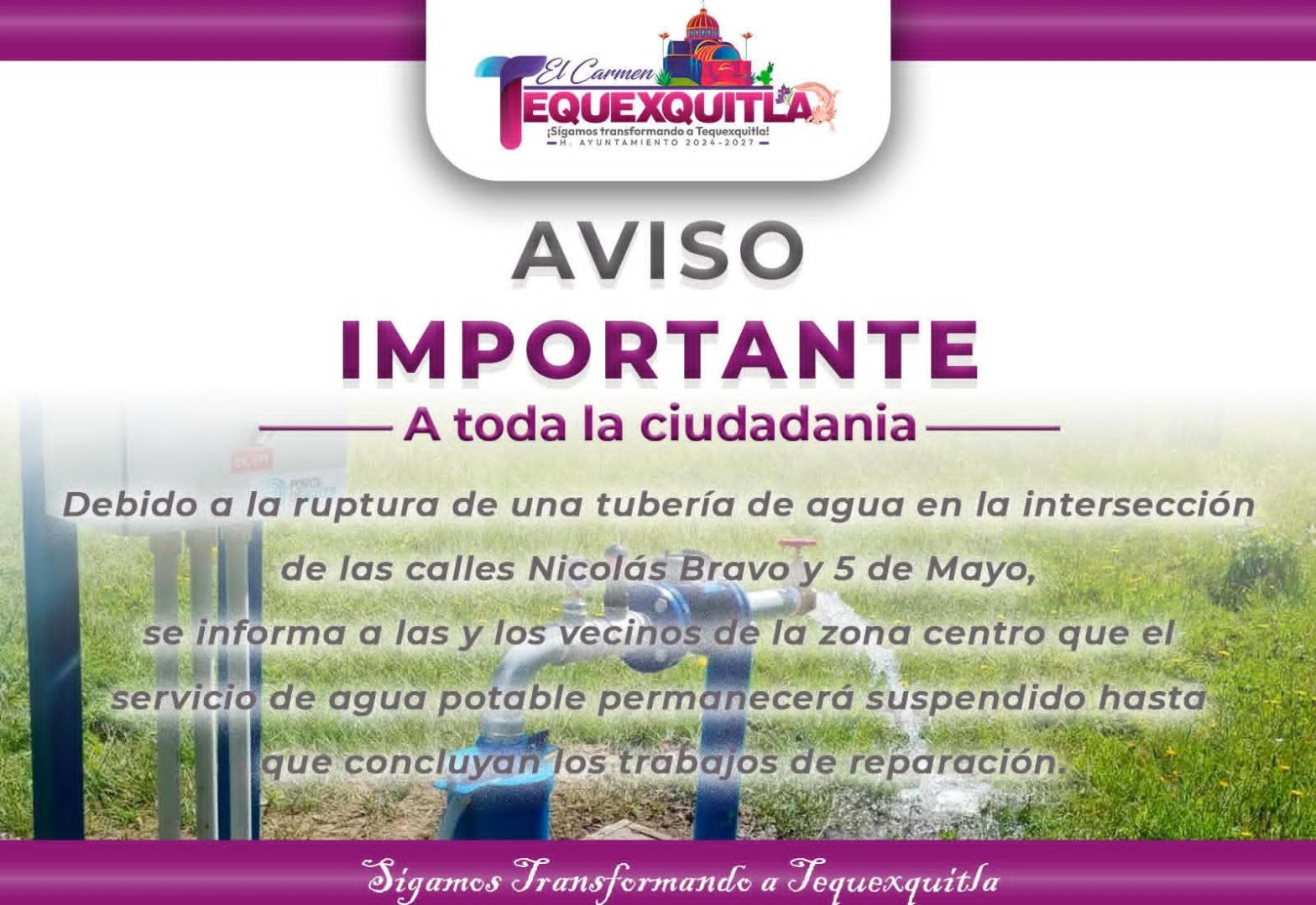 💧 Derivado de la ruptura de una tubería de agua potable en la intersección de las calles Nicolás Bravo y 5 de Mayo, se informa a las y los vecinos de la zona centro que el servicio de agua potable permanecerá suspendido de manera temporal, en tanto se realizan los trabajos de reparación correspondientes. 🚧🔧