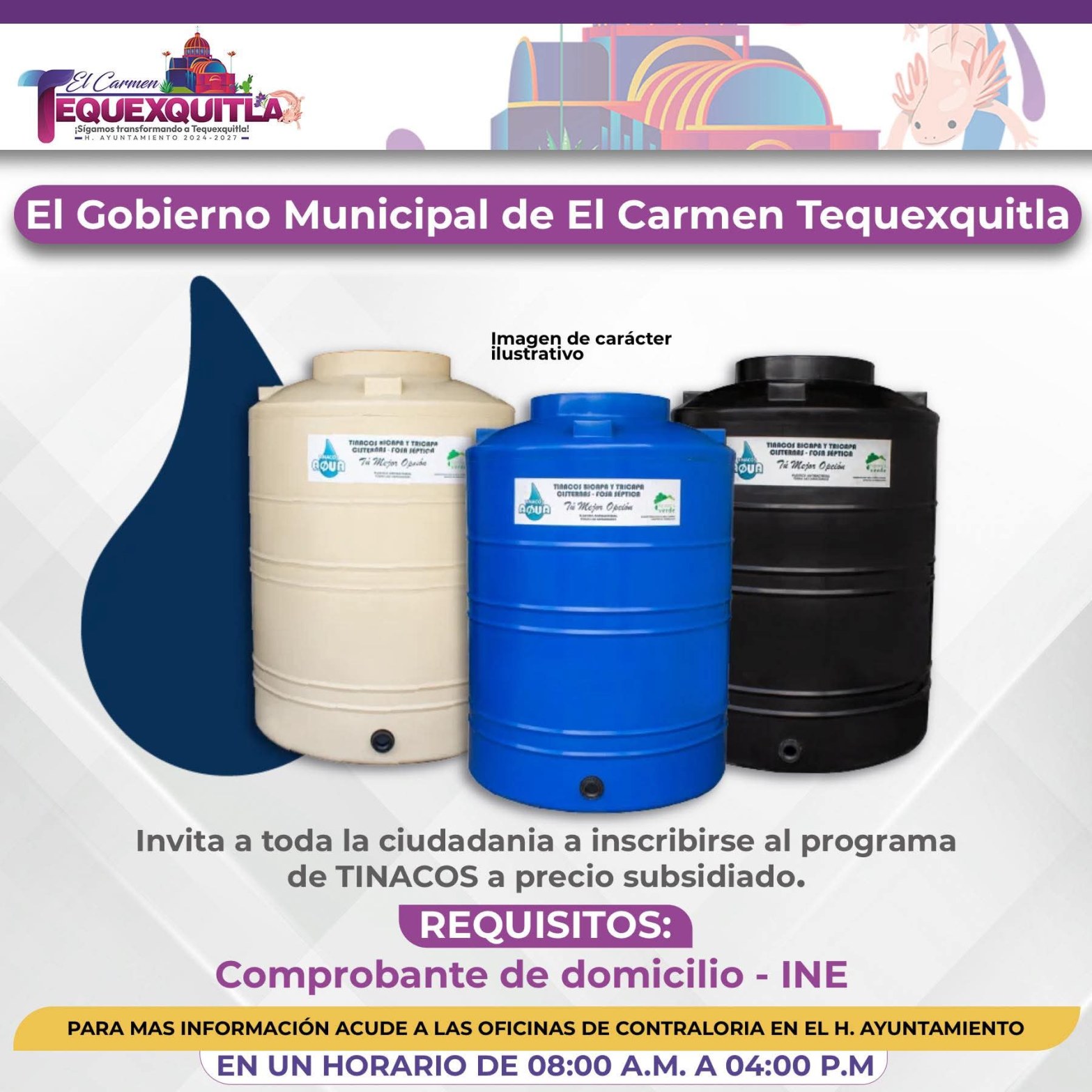 💧 El Gobierno Municipal de El Carmen Tequexquitla invita a toda la ciudadanía a formar parte del Programa de Tinacos a Precio Subsidiado, una iniciativa que busca apoyar la economía de las familias del municipio y mejorar las condiciones en los hogares.
