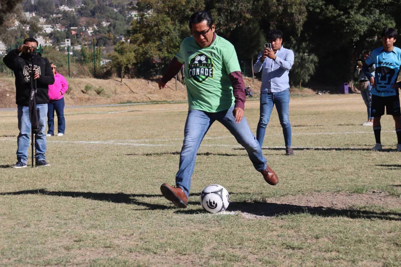 Está mañana, el presidente municipal Benjamín Atonal Conde estuvo presente en la 𝗘𝘁𝗮𝗽𝗮 𝗘𝘀𝘁𝗮𝘁𝗮𝗹 𝗱𝗲 𝗹𝗮 𝗖𝗼𝗽𝗮 𝗖𝗢𝗡𝗔𝗗𝗘 𝟮𝟬𝟮𝟲, celebrada en la Unidad Deportiva de Zaragoza, un evento que reúne a los mejores deportistas de fútbol en las categorías Sub-14 y Sub-15, tanto en rama varonil como femenil.