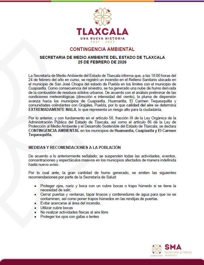 La Secretaría de Medio Ambiente del Estado de Tlaxcala informa que, a las 18:00 horas del 24 de febrero del presente año, se registró un incendio 🔥 en el Relleno Sanitario ubicado en el municipio de San José Chiapa, Puebla, en los límites con Cuapiaxtla 🌫️.