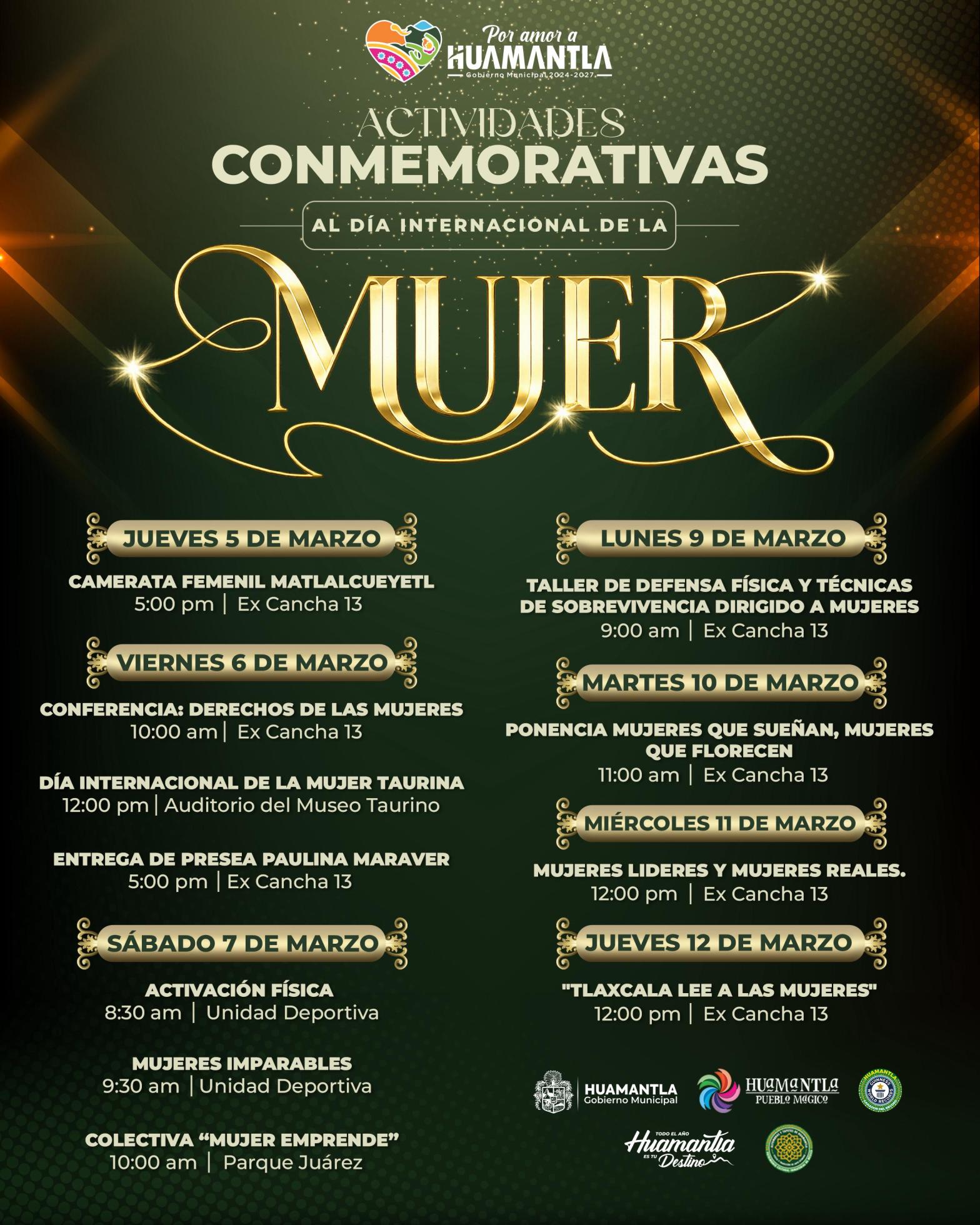 El viernes 6 de marzo se realizará la conferencia “Derechos de las Mujeres” a las 10:00 horas en el Auditorio Ex Cancha 13, posteriormente, a las 12:00 horas se llevará a cabo la conmemoración del Día Internacional de la Mujer Taurina en el Auditorio del Museo Taurino y a las 17:00 horas se efectuará la entrega de la Presea Paulina Maraver en el Auditorio Ex Cancha 13, como un reconocimiento a la mujer huamantleca.