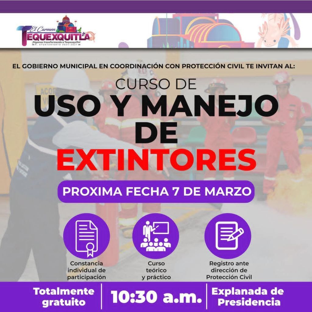 El Gobierno Municipal de El Carmen Tequexquitla, en coordinación con Protección Civil, invita a la población al curso de “Uso y Manejo de Extintores”, con el objetivo de fortalecer la cultura de la prevención y la seguridad.
