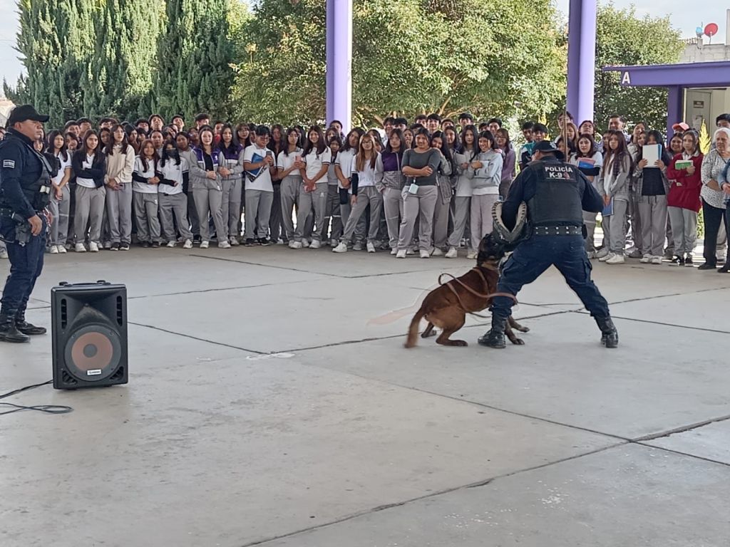 Huamantla, Tlax., 4 de marzo de 2026.— La Dirección de Seguridad Pública, Tránsito y Protección Civil de Huamantla llevó a cabo una demostración del agrupamiento K-9 en el plantel COBAT 02 turno vespertino, como parte de las acciones de proximidad social y prevención del delito que impulsa el Gobierno Municipal.
