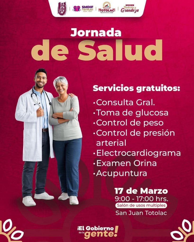 El Gobierno Municipal de Totolac 24-27, a través del DIF Municipal Totolac, invita a la ciudadanía a participar en la Jornada de Salud, donde se brindarán servicios médicos gratuitos para contribuir al bienestar de las familias del municipio.