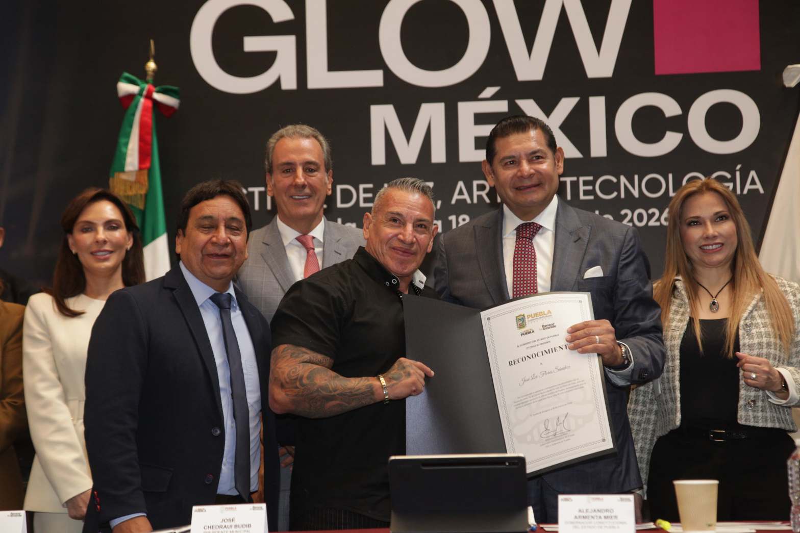 La presentación oficial del Festival Glow México 2026 se llevó a cabo en el Palacio Municipal encabezada por el gobernador, Alejandro Armenta, y el presidente municipal Pepe Chedraui. Se llevará a cabo en edificios y calles de la capital poblana del 11 al 19 de abril, por primera vez en América Latina, con la intervención de artistas internacionales.