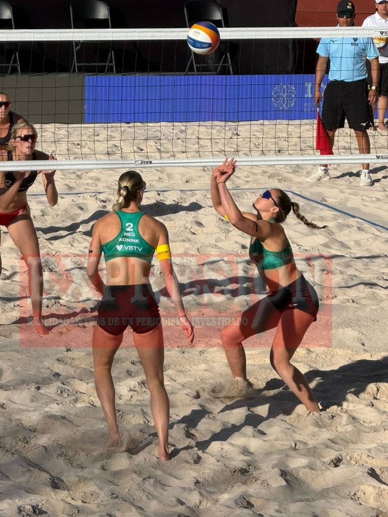 Intenso duelo internacional en la Plaza de Toros de Tlaxcala, se vivió la emoción del voleibol donde la dupla estadounidense conformada por Sara Hughes y Baterhorst se enfrentó a la pareja de Países Bajos integrada por Van Driel E. y Konink.