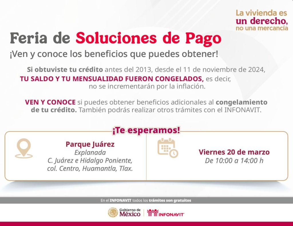 Con el objetivo de facilitar el acceso a opciones de regularización y orientación en materia de vivienda, el Gobierno Municipal de Huamantla invita a la ciudadanía a participar en la Feria de Soluciones de Pago que llevará a cabo el Instituto del Fondo Nacional de la Vivienda para los Trabajadores (INFONAVIT).
