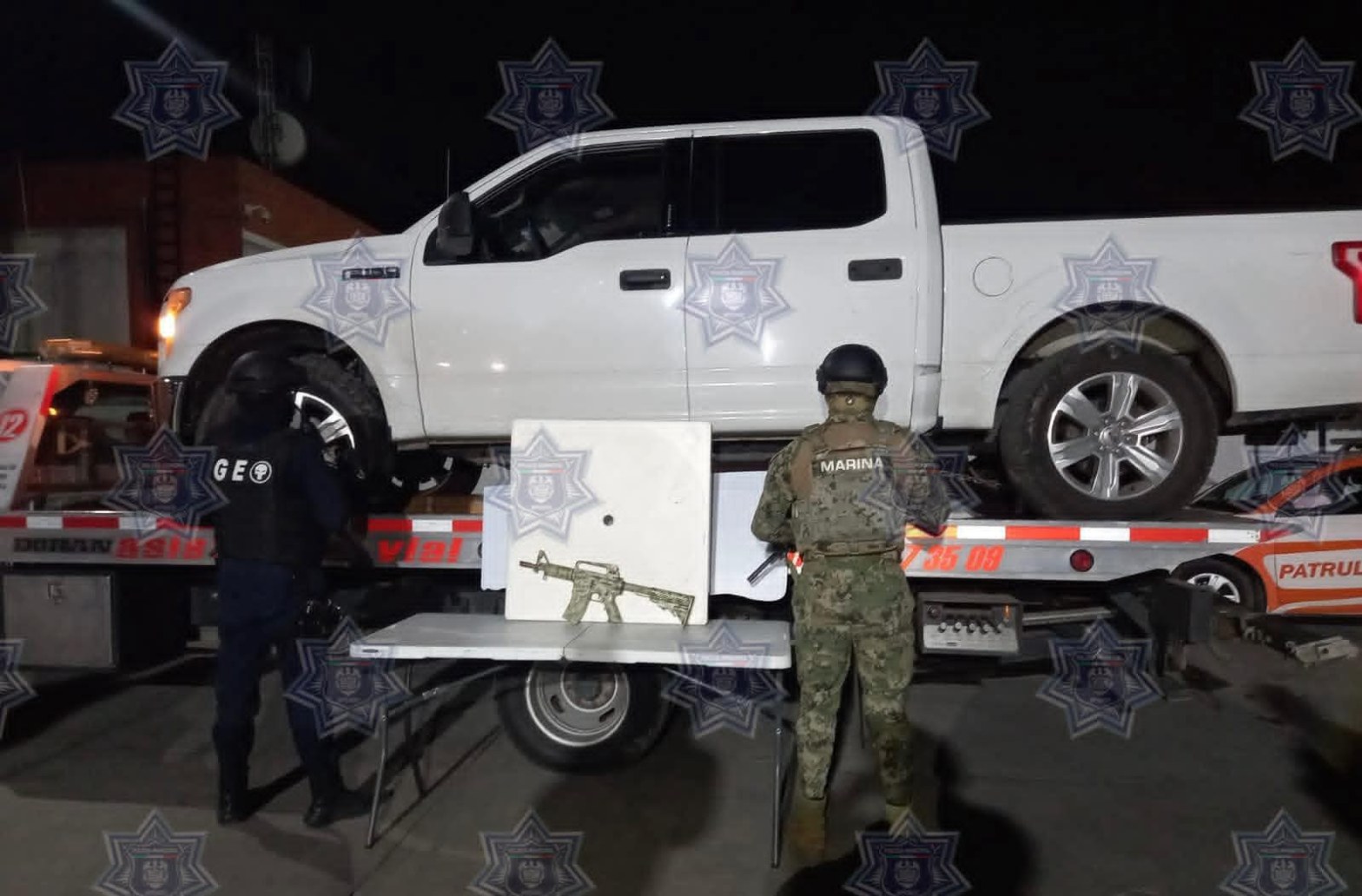 En la inspección del vehículo, los elementos policiales localizaron en su interior un arma de fuego de calibre de uso exclusivo de las Fuerzas Armadas. Tanto la camioneta como el arma fueron aseguradas y puestas a disposición de las autoridades competentes para las investigaciones correspondientes.