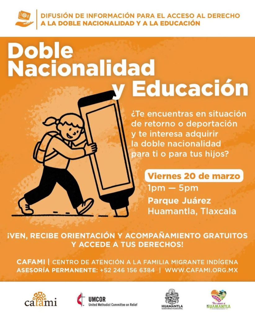 Huamantla, Tlaxcala.– Con el objetivo de brindar apoyo y orientación a personas en situación de retorno o deportación, el Gobierno Municipal de Huamantla, en coordinación con CAFAMI, invita a la ciudadanía a participar en la jornada de información sobre doble nacionalidad y acceso a la educación.