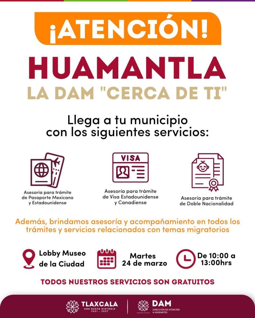Con el objetivo de acercar servicios y orientación a las familias huamantlecas, el Gobierno Municipal de Huamantla informa que este martes se contará con la presencia de la Dirección de Atención a Migrantes (DAM) del Gobierno del Estado de Tlaxcala, quien brindará atención directa a la ciudadanía.
