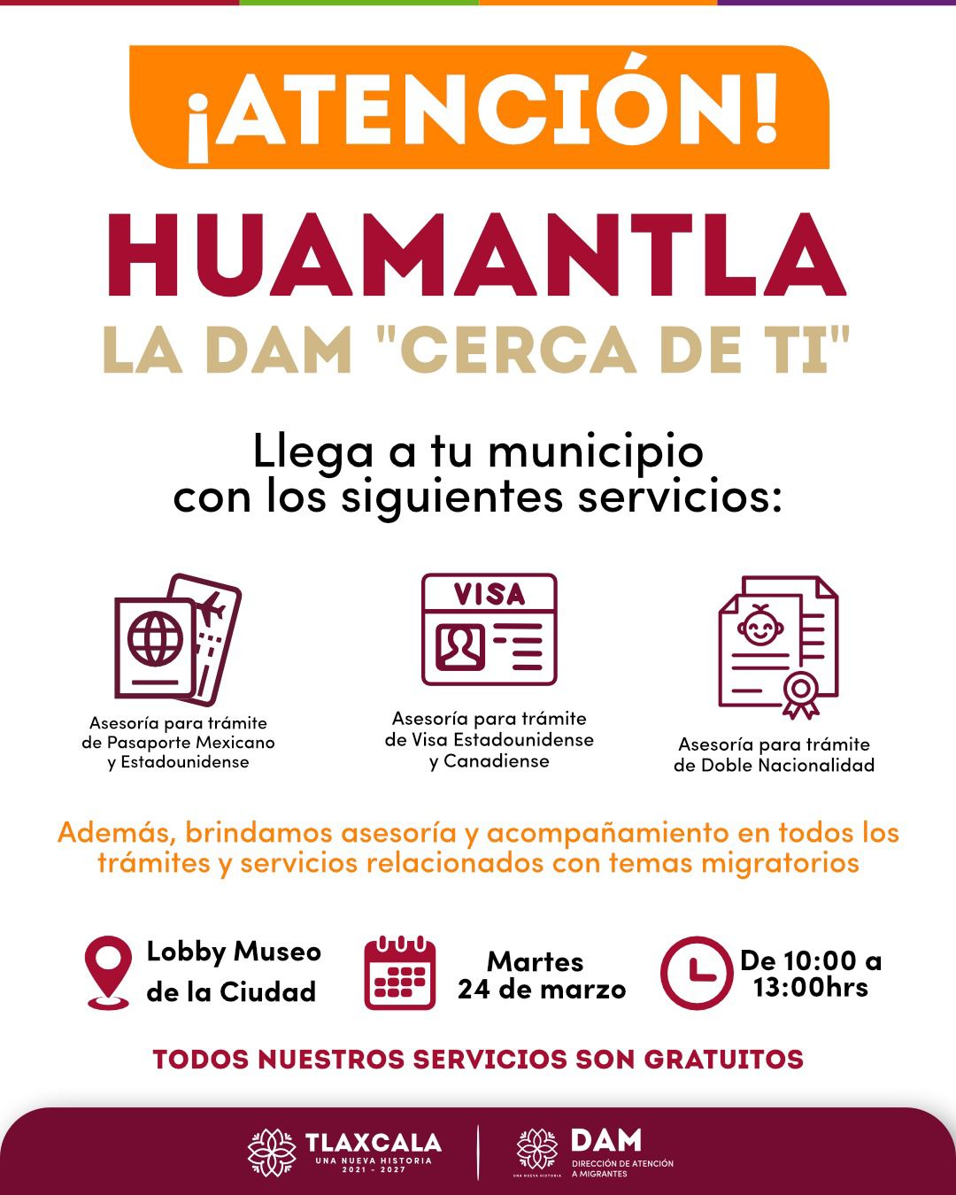 Con el objetivo de acercar servicios y orientación a las familias huamantlecas, el Gobierno Municipal de Huamantla informa que este martes se contará con la presencia de la Dirección de Atención a Migrantes (DAM) del Gobierno del Estado de Tlaxcala, quien brindará atención directa a la ciudadanía.
