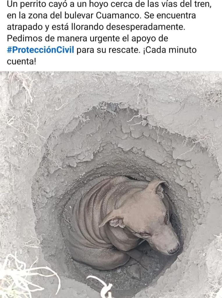 Huamantla, Tlax., — Elementos de la Dirección de Seguridad Pública, Tránsito y Protección Civil de Huamantla llevaron a cabo el rescate de un canino que se encontraba atrapado en un hoyo en la zona del camino viejo a Santa Ana Ríos, entre el boulevard Cuamanco y las vías férreas.