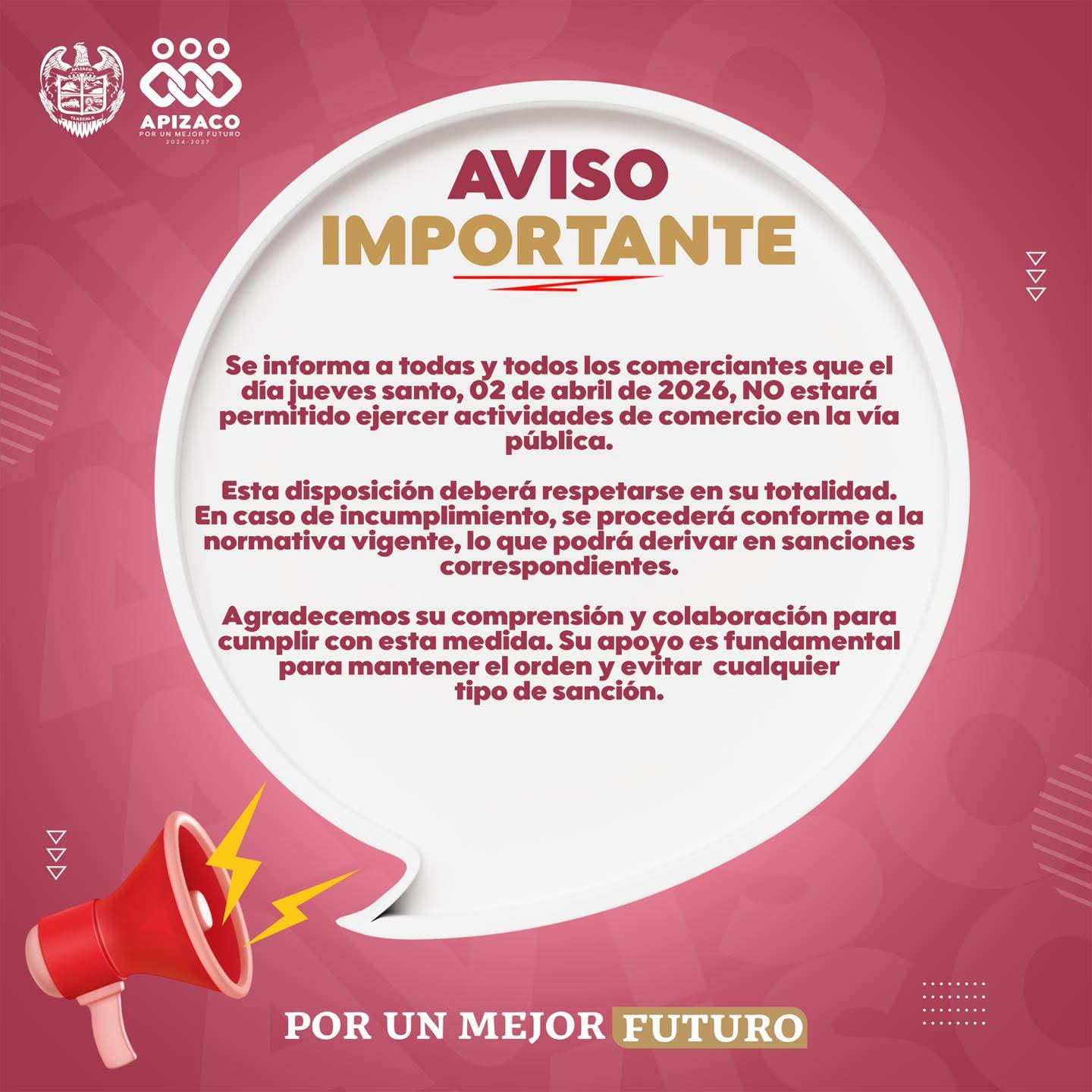Autoridades del municipio de Apizaco emitieron un aviso importante dirigido a todas y todos los comerciantes, informando que el próximo jueves 2 de abril de 2026, con motivo de la conmemoración de la Semana Santa, no estará permitido ejercer actividades comerciales en la vía pública.