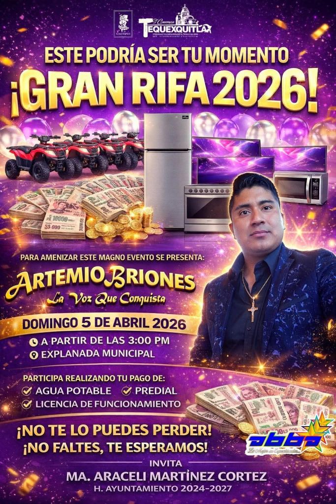 El Gobierno Municipal de El Carmen Tequexquitla que preside Araceli Martínez Cortez, invita a toda la ciudadanía a ser parte de la Gran Rifa 2026 🎉🎟️, un evento pensado para reconocer la participación y compromiso de las y los contribuyentes 🙌.