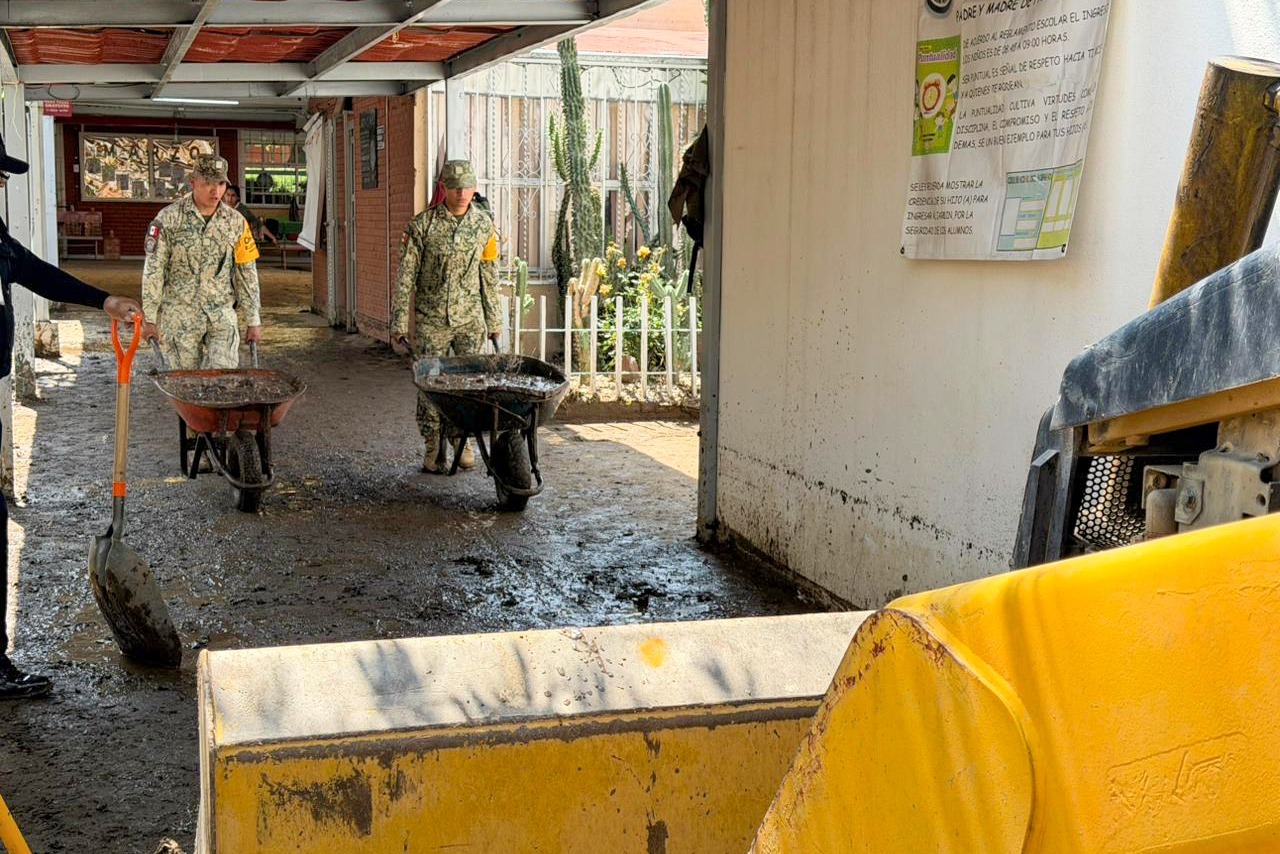 Con una respuesta de atención inmediata, brigadas del programa “Más territorio y menos escritorio”, madres de familia y elementos del Ejército Mexicano llevan a cabo labores conjuntas de desazolve y limpieza.
