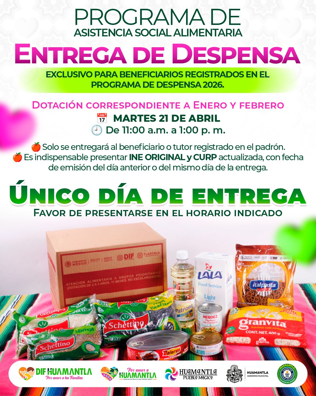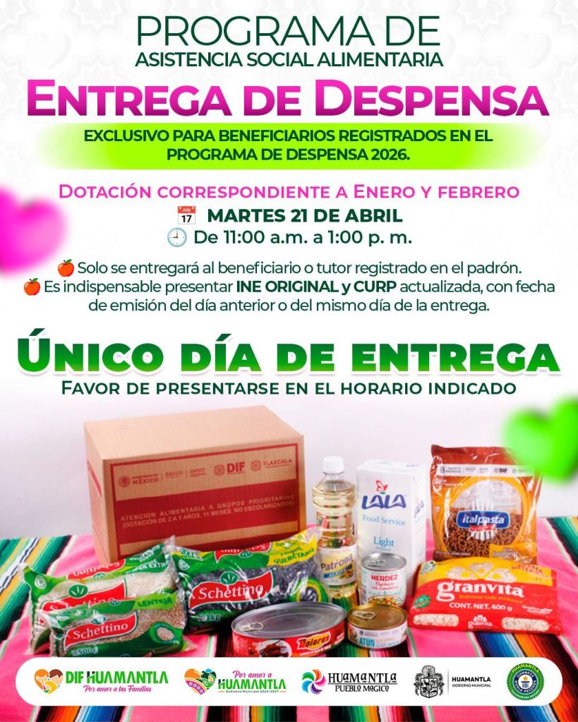 La jornada de entrega se realizará el próximo martes 21 de abril, en un horario de 11:00 de la mañana a 1:00 de la tarde, en las instalaciones del SMDIF Huamantla, dirigida exclusivamente a las y los beneficiarios que forman parte del padrón vigente.