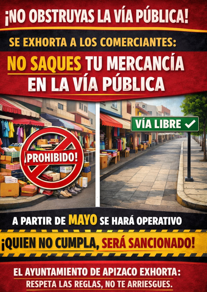 A través de este llamado, se exhorta a las y los comerciantes a no colocar productos en banquetas, calles o espacios comunes, ya que esta práctica afecta la movilidad, la seguridad y la imagen urbana del municipio.