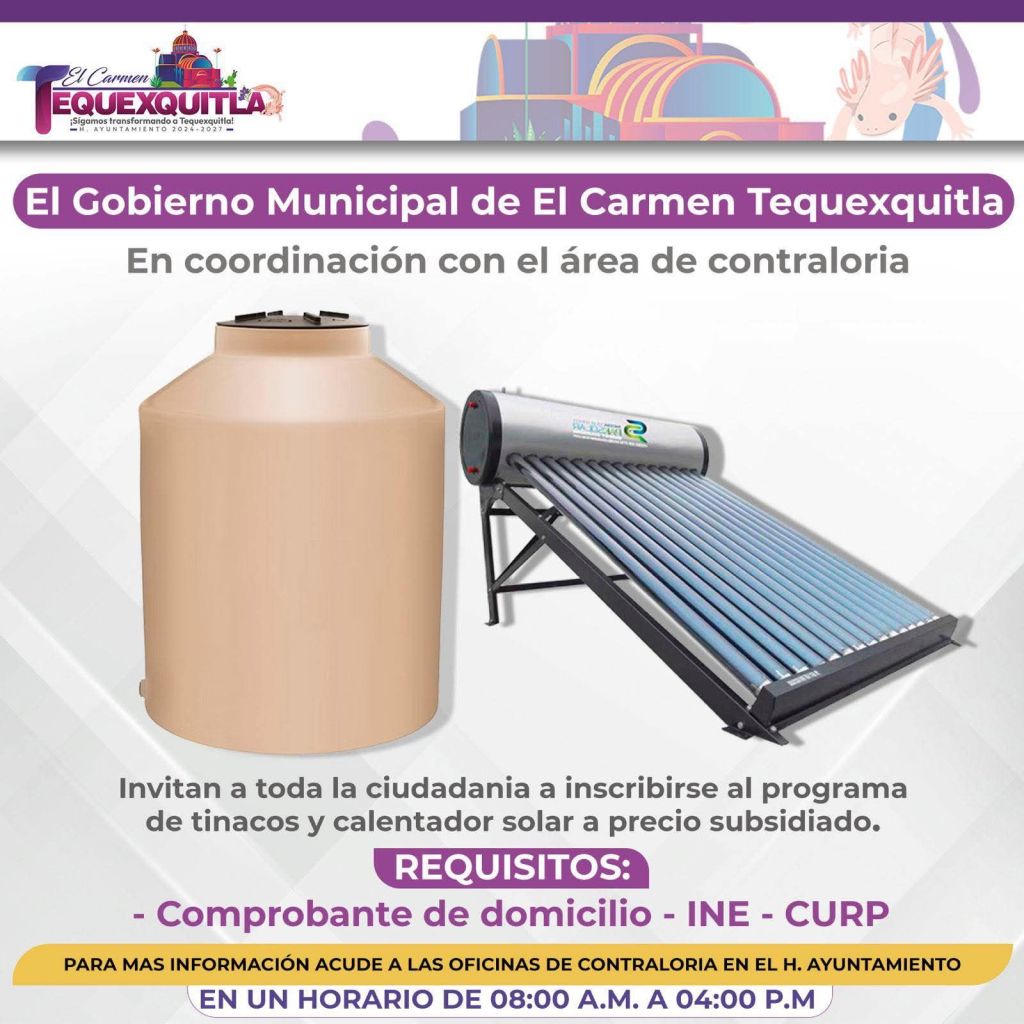El Gobierno Municipal de El Carmen Tequexquitla, en coordinación con el área de Contraloría, invita a toda la ciudadanía a formar parte del programa de tinacos y calentadores solares a precio subsidiado. ☀️💧