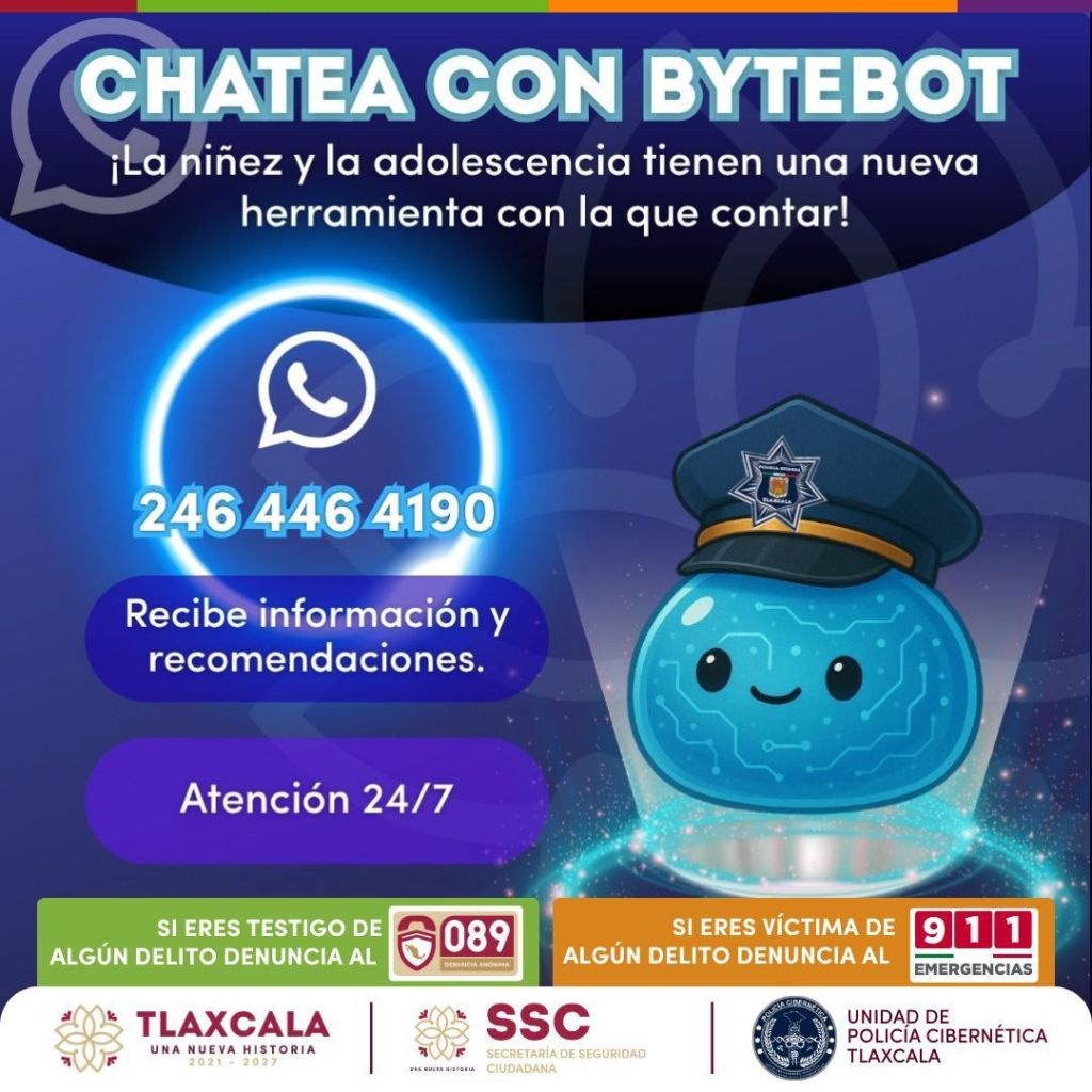 La Secretaría de Seguridad Ciudadana (SSC) de Tlaxcala activó una estrategia para proteger a niñas, niños y adolescentes frente a los ciberdelitos, con el lanzamiento de “BYTEBOT”, un chatbot que brinda orientación y acompañamiento en tiempo real ante riesgos en el entorno digital.