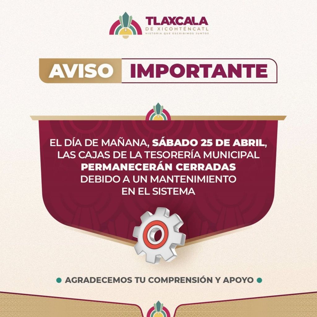 El Ayuntamiento de Tlaxcala informa que este sábado 25 de abril, la Tesorería Municipal suspenderá temporalmente el servicio de cobro en cajas debido a un mantenimiento programado en su sistema. La medida forma parte de las acciones para optimizar el funcionamiento de la plataforma y fortalecer la atención a la ciudadanía. Ante ello, se exhorta a las y los contribuyentes a tomar previsiones, ya que el servicio se restablecerá una vez concluidas las labores técnicas previstas.