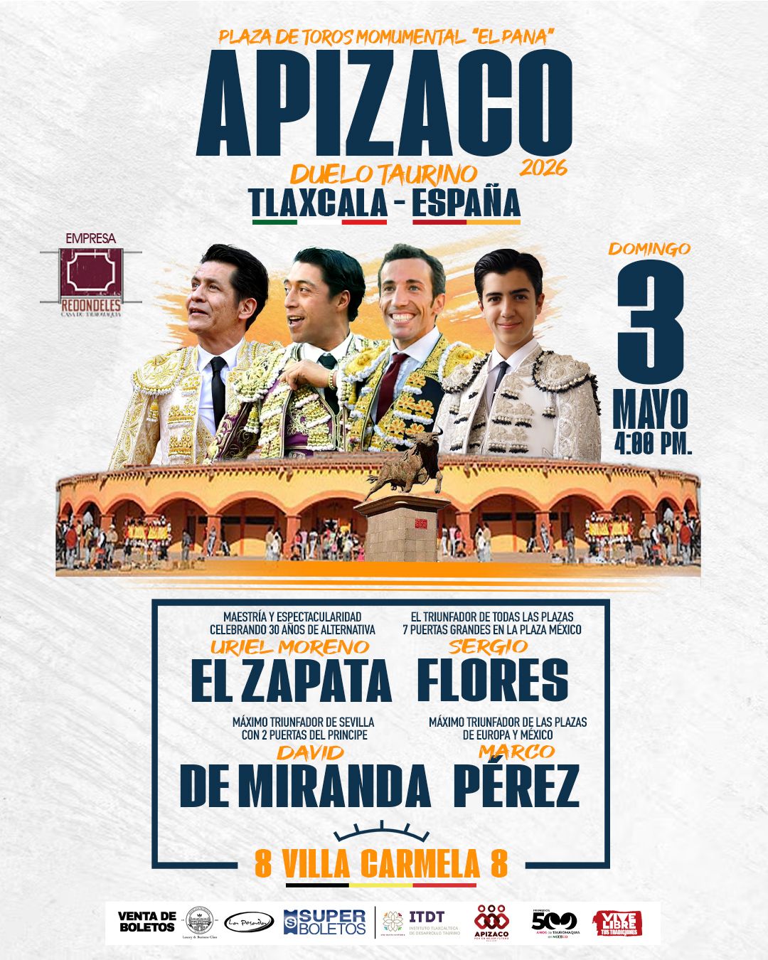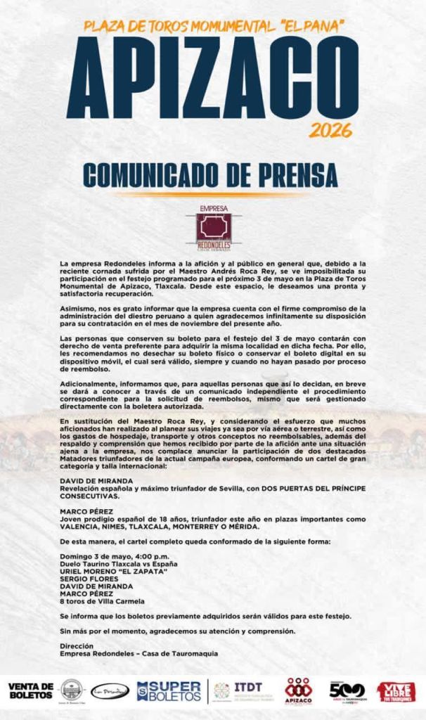 El Ayuntamiento de Apizaco informa a la ciudadanía que, de acuerdo con lo dado a conocer por la empresa organizadora Redondeles, el matador Andrés Roca Rey no podrá presentarse el próximo domingo 3 de mayo en la Plaza Monumental de Apizaco, debido a una lesión sufrida recientemente.