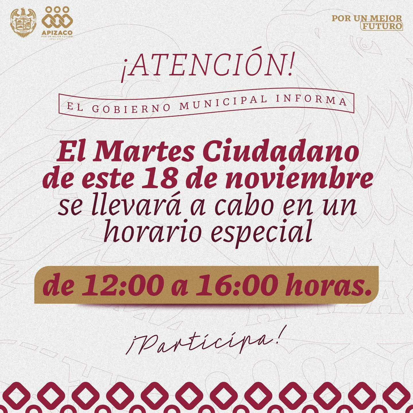 PRÓXIMO MARTES CIUDADANO EN APIZACO TENDRÁ HORARIO ESPECIAL