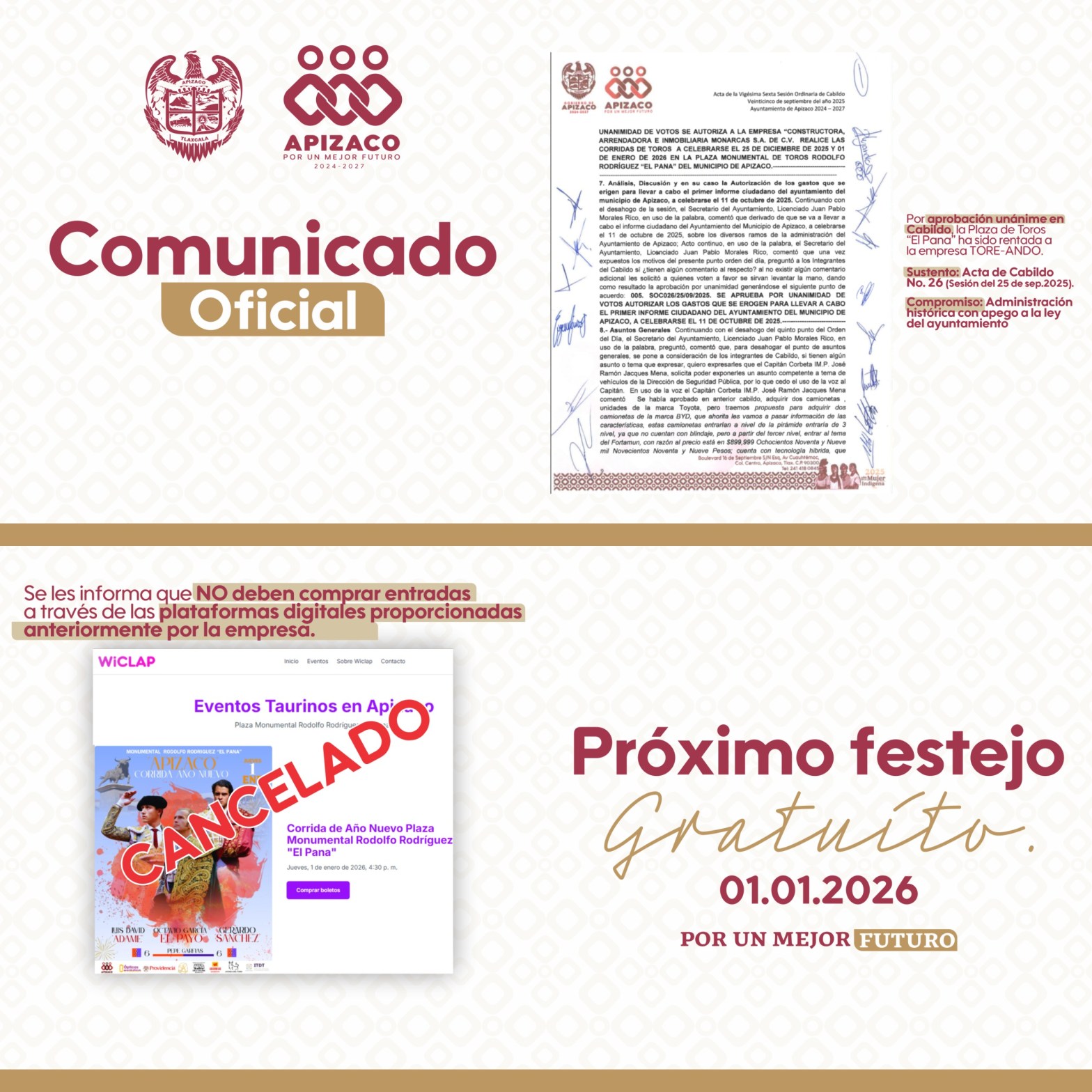 28 DE DICIEMBRE 2025 El Gobierno de Apizaco informa a la ciudadanía y a la afición taurina: El Gobierno de Apizaco, como parte de una administración histórica y con total apego a la legalidad, informa que en sesión de Cabildo celebrada el pasado 25 de septiembre, se aprobó por unanimidad la renta de la PlazaSigue leyendo «COMUNICADO DE PRENSA GOBIERNO DE APIZACO INFORMA QUE SE CANCELA EVENTO TAURINO DEL DÍA 1 DE ENERO»