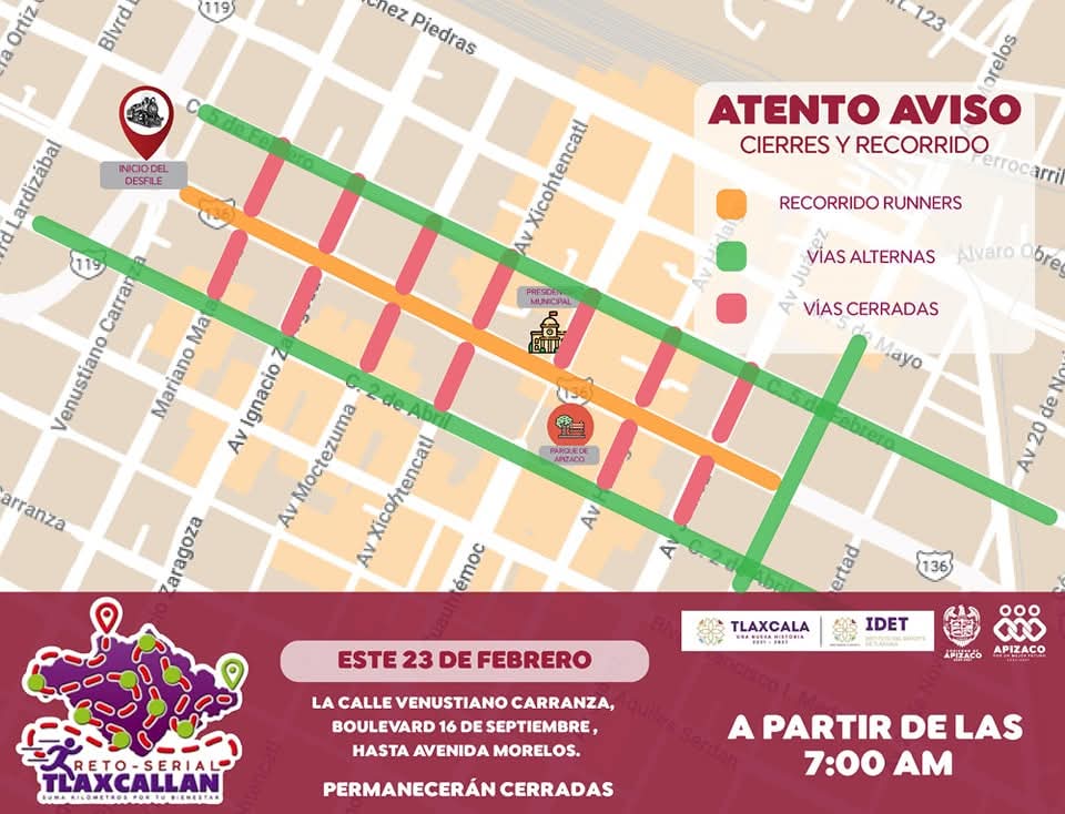 21 DE FEBRERO 2025 🚨 ¡Atención, Apizaco! 🚨 Este 23 de febrero, a partir de las 7:00 AM, se realizarán cierres viales debido al evento Reto-Serial Tlaxcallan. 🏃♂️💨 🔴 Calles cerradas:📍 Venustiano Carranza📍 Boulevard 16 de Septiembre📍 Avenida Morelos📍 Algunas calles aledañas (ver mapa) 🟢 Vías alternas disponibles: Se recomienda tomar rutas alternas para evitarSigue leyendo «ATENCION APIZACO CIERRES VIALES EN APIZACO POR RETO-SERIAL TLAXCALLAN»
