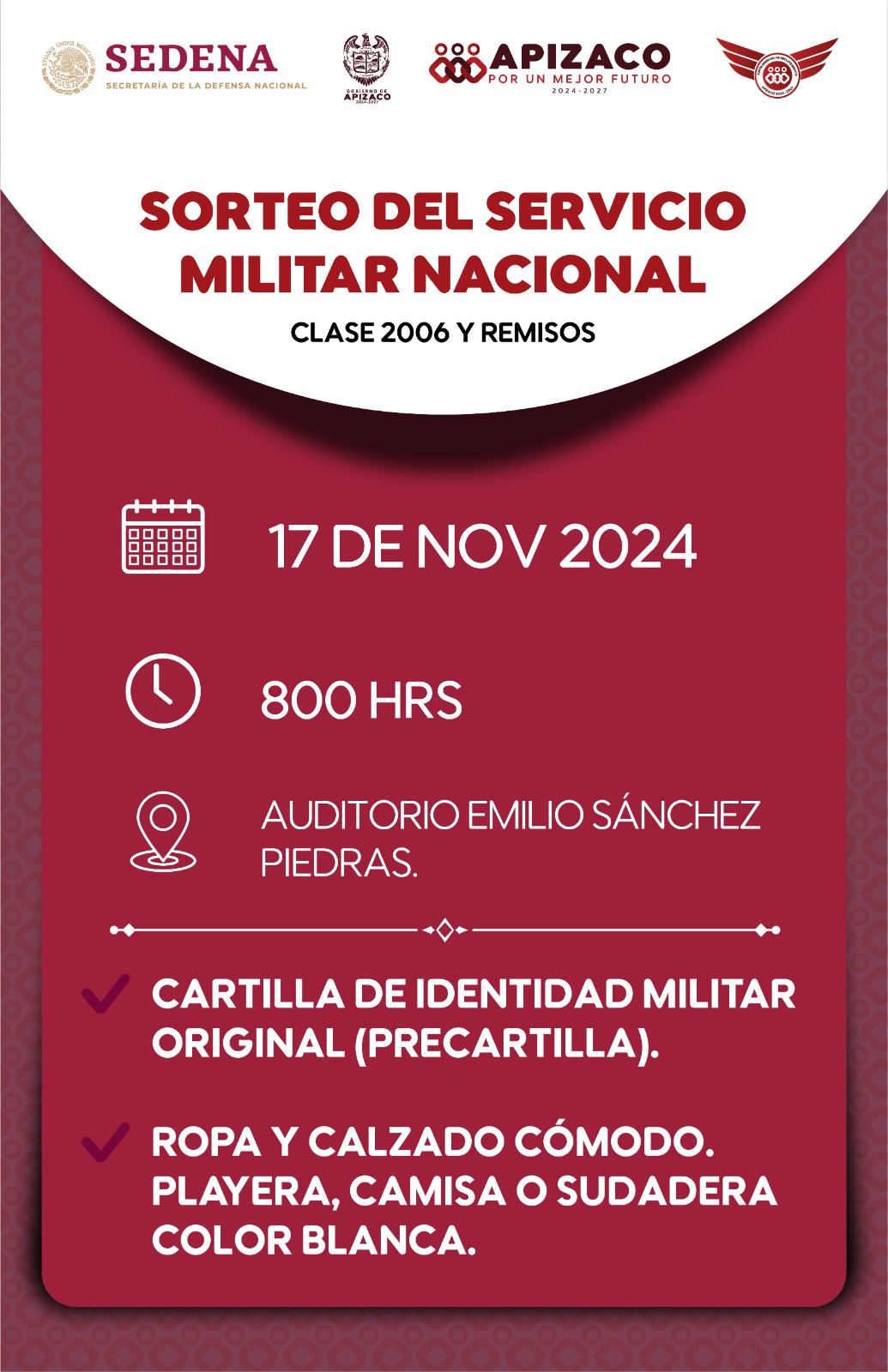 8 DE NOVIEMBRE 2024 La Secretaría de la Defensa Nacional, a través de la 23/a. Zona militar informa a los jóvenes que obtuvieron su cartilla de identidad militar en el presente año, clase “2006” y remisos, que el Sorteo del Servicio Militar Nacional se llevará a cabo a las 09:00 horas del día 17 deSigue leyendo «EL PRÓXIMO DOMINGO SE LLEVARÁ A CABO EL SORTEO DEL SERVICIO MILITAR NACIONAL «