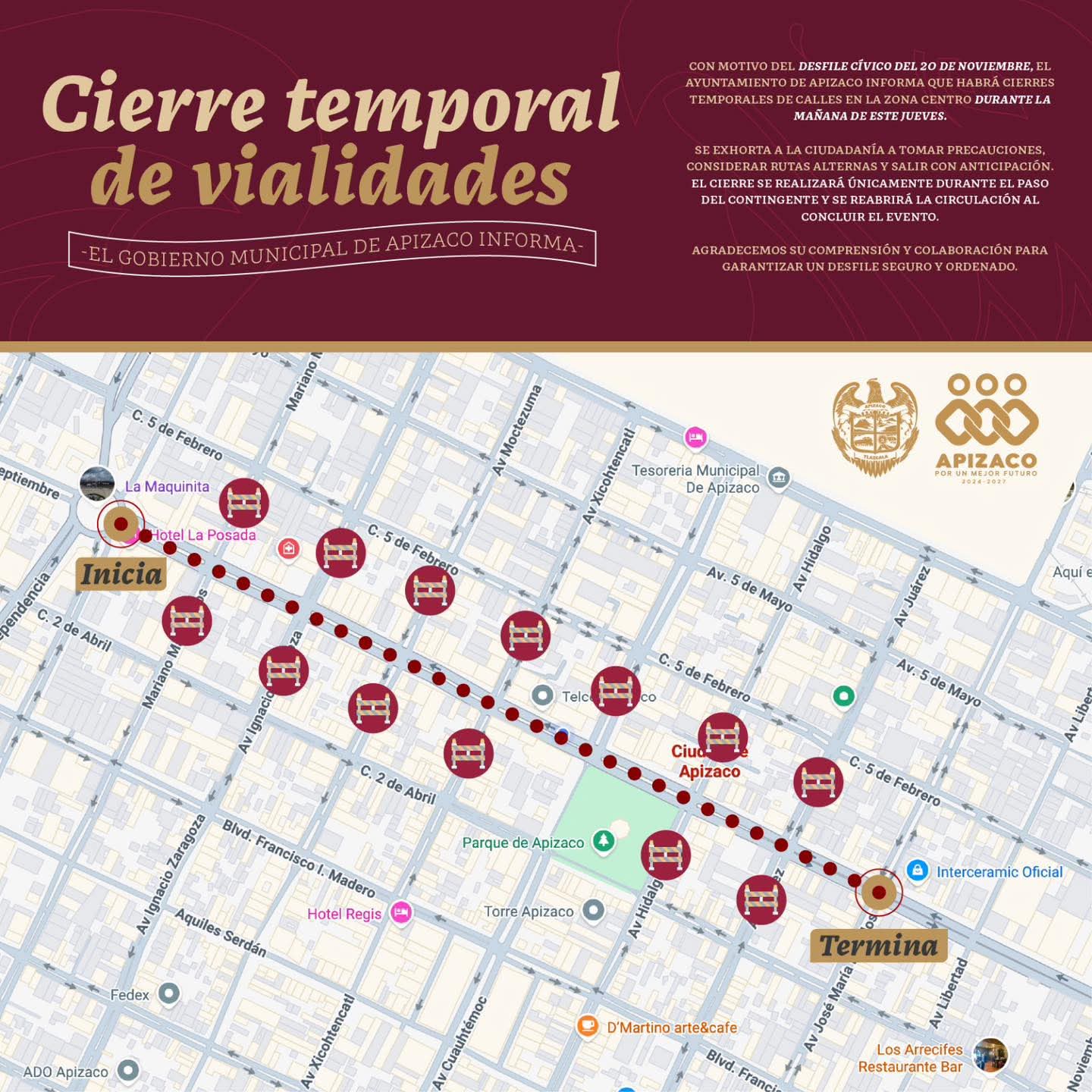 19 DE NOVIEMBRE 2025 🚨ATENCIÓN🚨 Con motivo del Desfile Cívico por el CXV Aniversario de la Revolución Mexicana, se realizarán cierres temporales de calles en la zona centro del municipio. El desfile dará inicio a las 08:30 horas, por lo que las vialidades señaladas en la imagen permanecerán cerradas antes del comienzo del evento paraSigue leyendo «CIERRES TEMPORALES EN APIZACO POR ANIVERSARIO DE LA REVOLUCIÓN MEXICANA»
