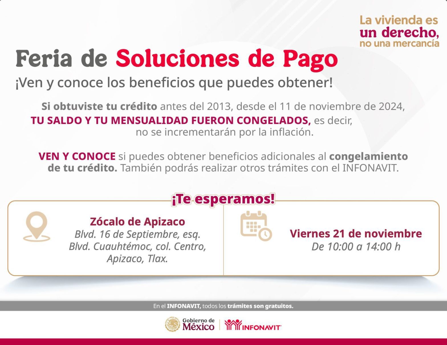 19 DE NOVIEMBRE 2025 #Apizaco El Ayuntamiento de Apizaco, que encabeza el presidente municipal, Javier Rivera Bonilla, en coordinación con el Instituto del Fondo Nacional de la Vivienda para los Trabajadores (Infonavit), realizarán la Feria de Soluciones de Pago el próximo viernes 21 de noviembre, con el objetivo de acercar servicios y alternativas financieras aSigue leyendo «TENDRÁ APIZACO FERIA DE SOLUCIONES INFONAVIT EN BENEFICIO DE ACREDITADOS DEL NORTE DE TLAXCALA»
