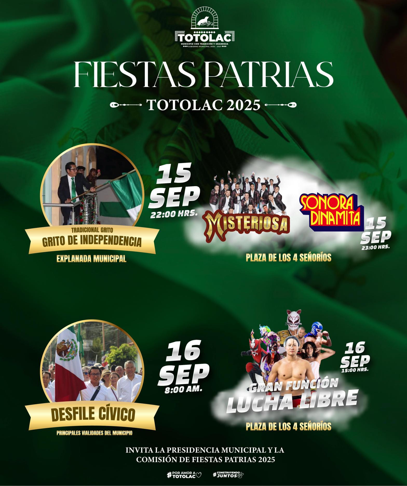 14 DE SEPTIEMBRE 2025 🗓15 DE SEPTIEMBRE🇲🇽GRITO DE INDEPENDENCIA⏰22:00 HRS📍EXPLANADA MUNICIPAL 🗓15 DE SEPTIEMBRE🕺💃PRESENTACIÓN DE LA BANDA MISTERIOSA Y LA SONORA DINAMITA⏰23:00 HRS📍PLAZA DE LOS 4 SEÑORITOS 🗓16 DE SEPTIEMBRE🇲🇽DESFILE CÍVICO⏰8:0O AM📍PRINCIPALES CALLES DEL MUNICIPIO 🗓16 DE SEPTIEMBRE🤡👾GRAN FUNCIÓN DE LUCHA LIBRE⏰15:00 HRS📍PLAZA DE LOS 4 SEÑORIOS Gobierno Municipal de Totolac 24-27 Benjamín Atonal Conde
