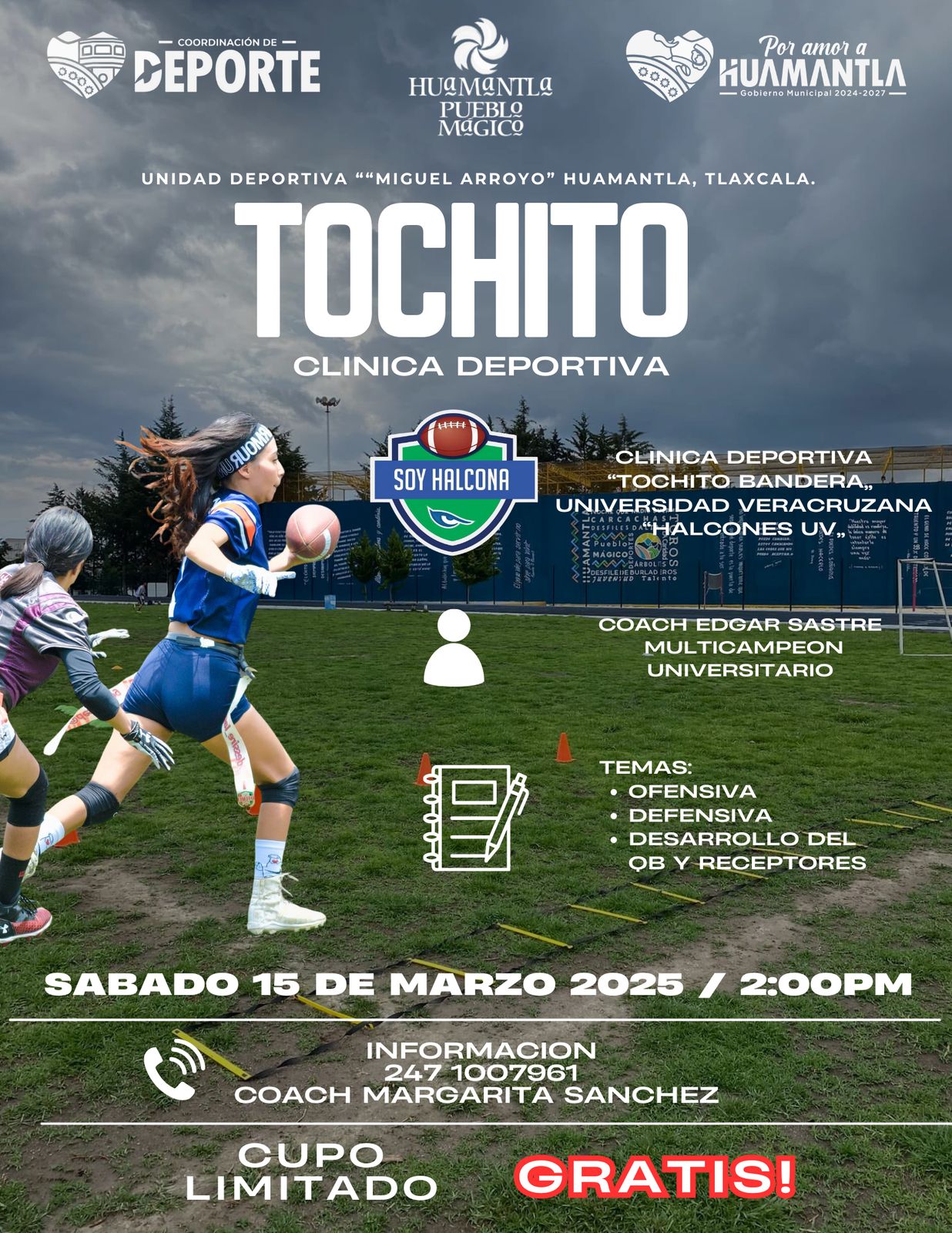 13 DE MARZO 2025 El Gobierno de Huamantla, a través de la Coordinación de Deporte, invita a toda la comunidad interesada a participar en la Clínica Deportiva «Tochito Bandera Universidad Veracruzana Halcones UV», la cual se llevará a cabo este sábado 15 de marzo a las 14:00 horas, en la Unidad Deportiva “Miguel Arroyo Rosales”.Sigue leyendo «INVITA COORDINACIÓN DE DEPORTE A LA CLÍNICA DE TOCHITO BANDERA EN HUAMANTLA»