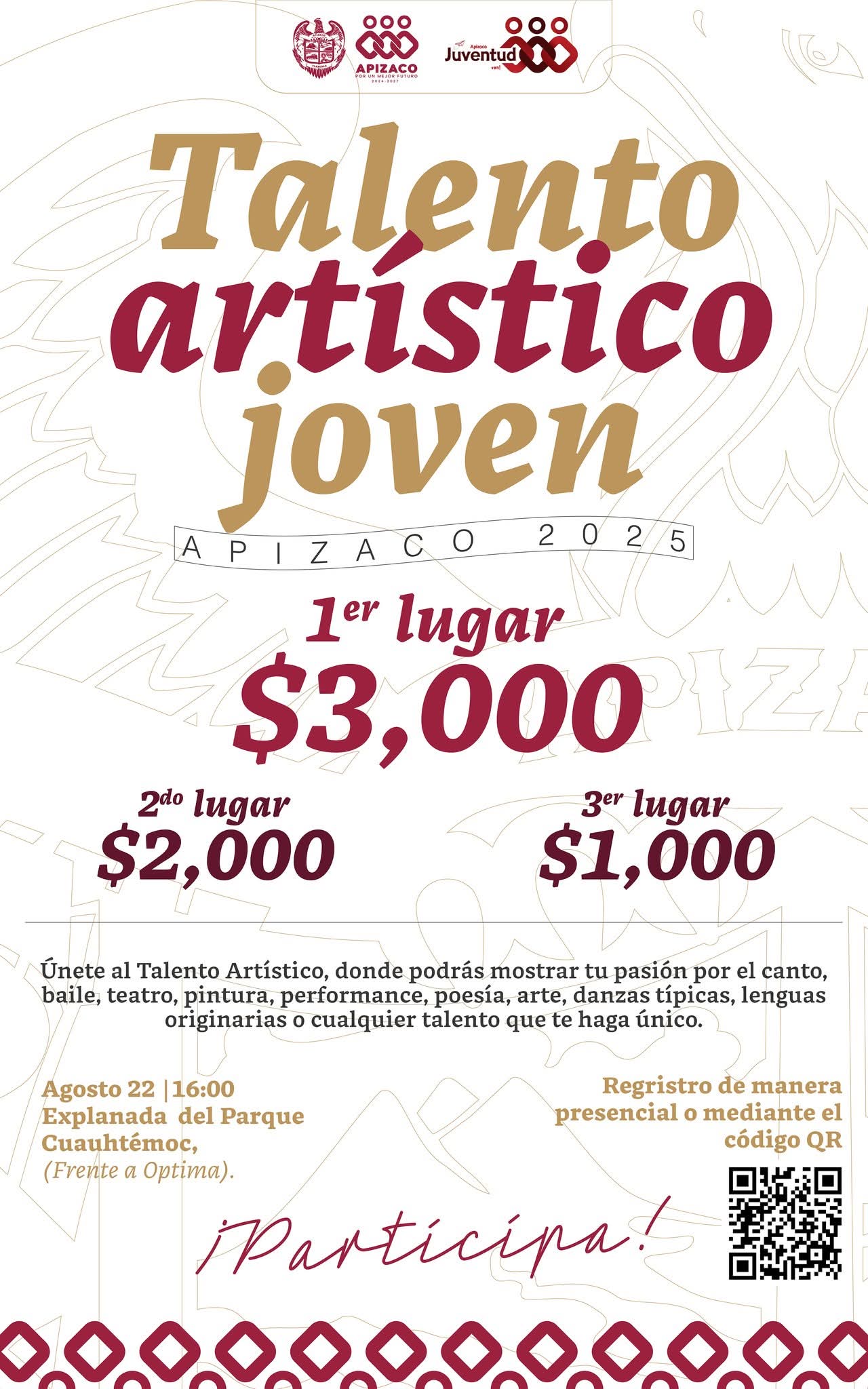18 DE AGOSTO 2025 ¡Demuestra tu talento y gana! ✨🎤 Este 22 de agosto te esperamos en la Explanada del Parque Cuauhtémoc para el gran concurso Talento Artístico Joven Apizaco 2025 📌 Canto, baile, teatro, pintura, performance, poesía, arte, danzas típicas, lenguas originarias… ¡todo talento es bienvenido!🕓 Hora: 16:00 hrs.📍 Frente a Óptima📝 Registro presencialSigue leyendo «EN APIZACO DEMUESTRA TU TALENTO Y GANA»