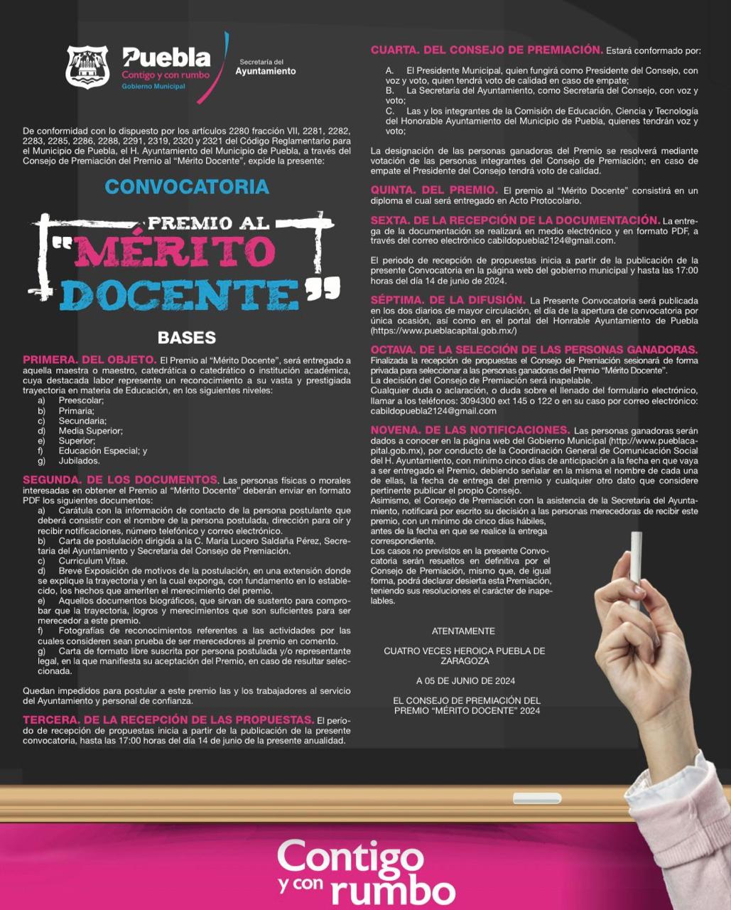 18 DE JUNIO 2024 El Ayuntamiento de Puebla –que preside Adán Domínguez Sánchez— mantendrá abierta la convocatoria del Premio al “Mérito Docente” 2024 hasta el domingo 23 de junio, para que la ciudadanía interesada sea reconocida por su labor destacada en el ámbito de la educación. Dicho premio lo otorga el Gobierno Municipal como unaSigue leyendo «CONVOCATORIA AL PREMIO “MÉRITO DOCENTE” CIERRA ESTE 23 DE JUNIO»