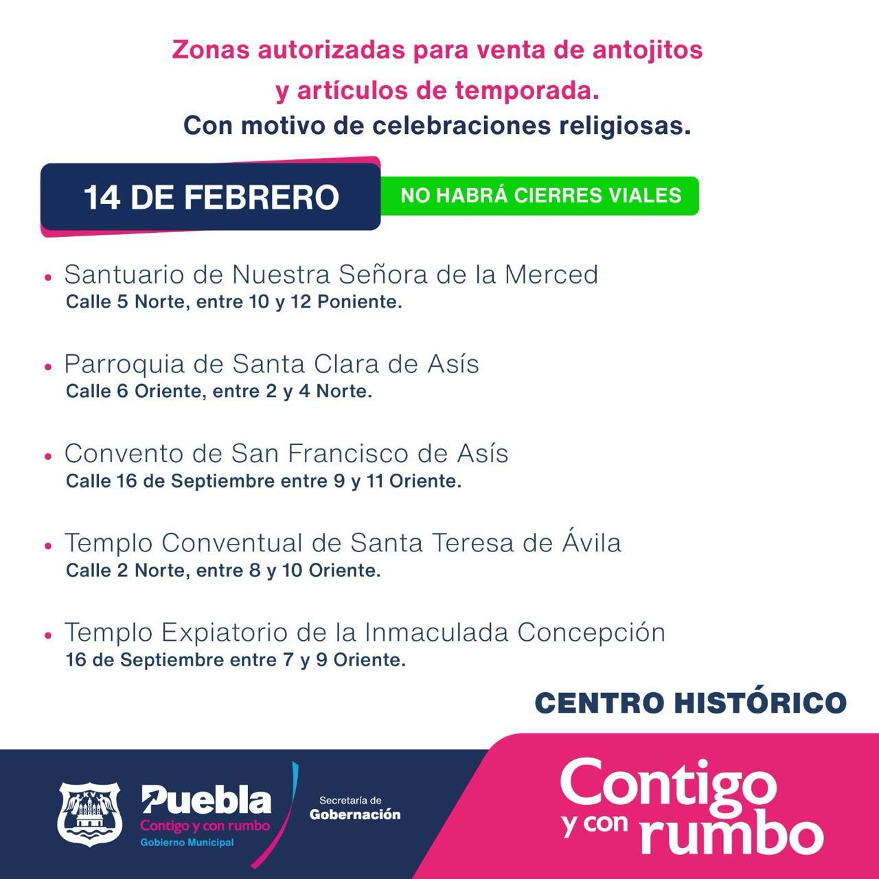 12 DE FEBRERO 2024 – No se contemplan cierres a la circulación vial en ninguno de los puntos con actividad comercial itinerante. Con motivo del inicio de la temporada de cuaresma, el Ayuntamiento de Puebla, a través de Secretaría de Gobernación Municipal, autorizará la venta de antojitos y artículos de temporada el próximo miércoles 14Sigue leyendo «POR INICIO DE CUARESMA, AYUNTAMIENTO DE PUEBLA AUTORIZA VENTA DE ARTÍCULOS DE TEMPORADA EN OCHO PUNTOS DE LA CIUDAD»