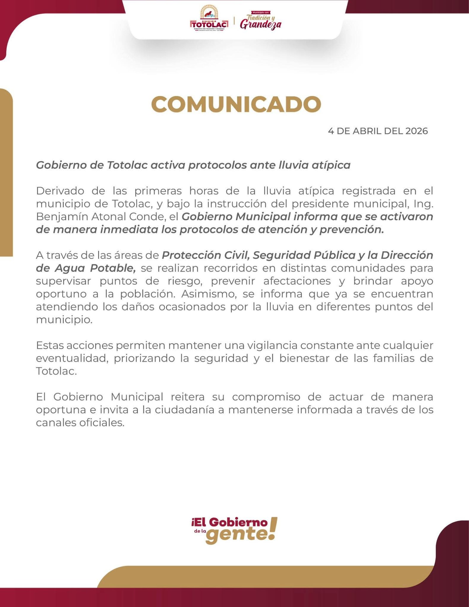 4 DE ABRIL 2026 🌧️ Ante la lluvia atípica registrada desde las primeras horas en #Totolac, y por instrucción del presidente municipal, Ing. Benjamín Atonal Conde, se activaron de inmediato los protocolos de atención. Elementos de Protección Civil, Seguridad Pública y Agua Potable realizan recorridos en las comunidades y ya atienden los daños ocasionados porSigue leyendo «SE ACTIVAN PROTOCOLOS DE ATENCIÓN POR LLUVIA ATÍPICA EN TOTOLAC»