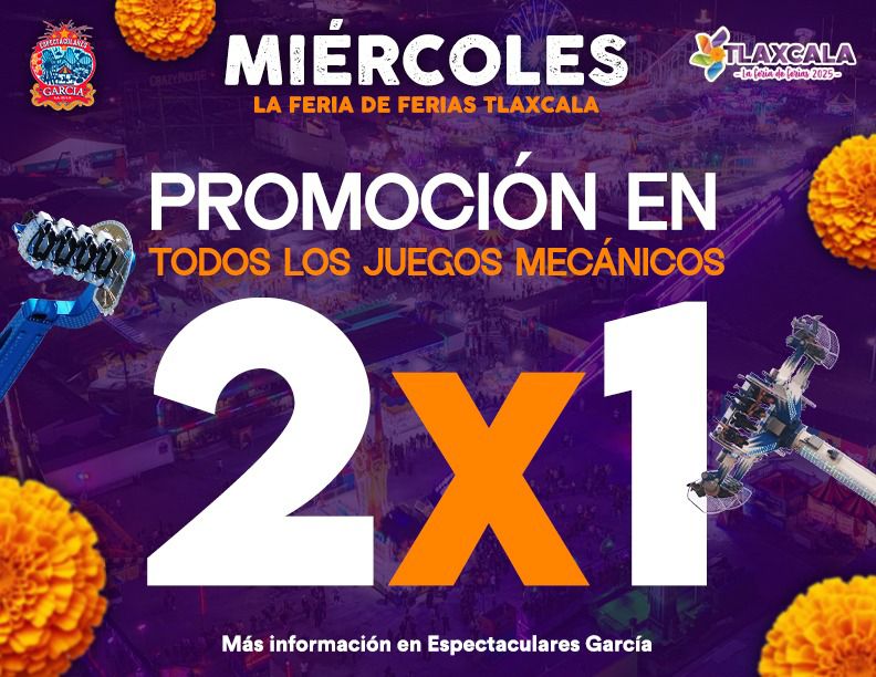 11 DE NOVIEMBRE 2025 ¡TLAXCALA! ‼️✅ Hoy ÚLTIMO MIÉRCOLES de 2×1 en TODOS los juegos mecánicos de @Tlaxcala la Feria de Ferias 2025 🤩✨ Ven y vive una experiencia espectacular