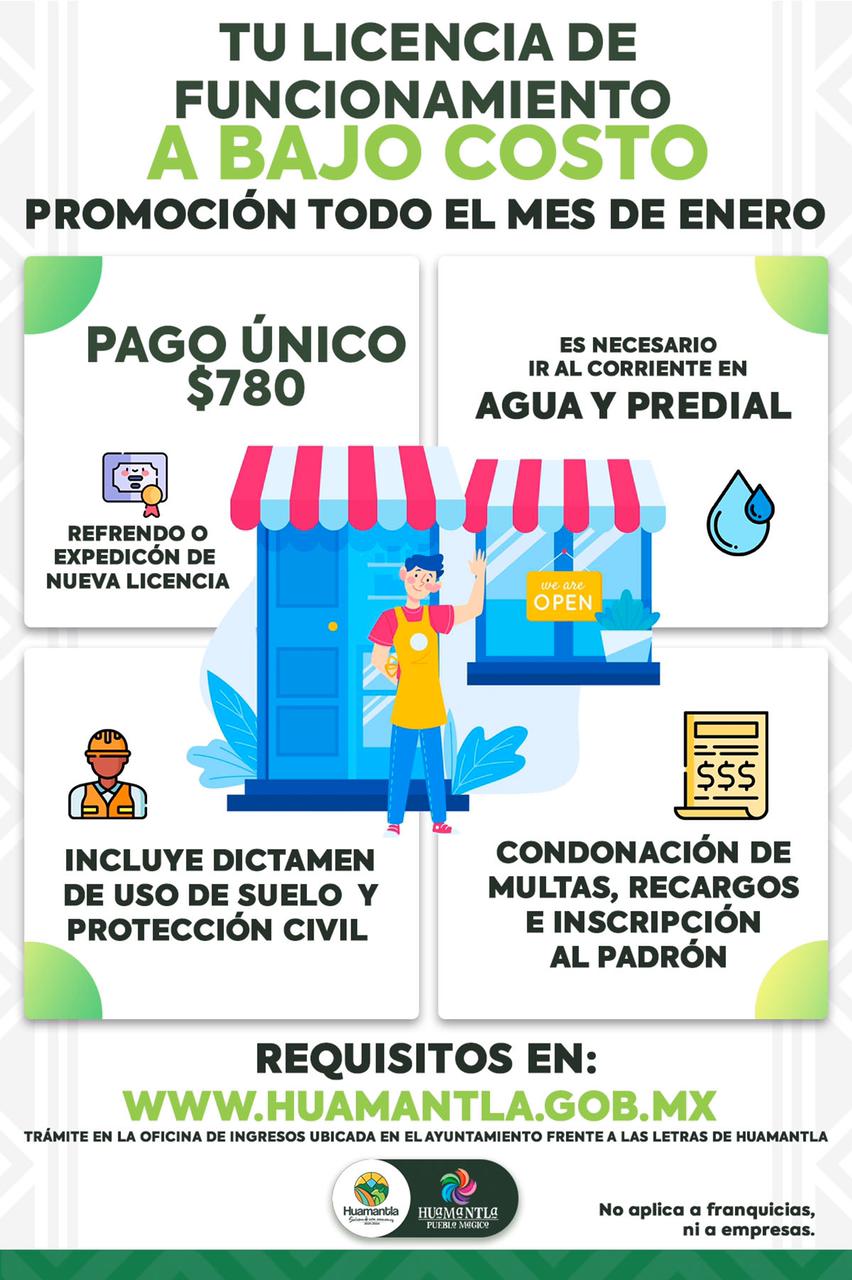 La administración municipal invita a los dueños a regularizar sus licencias de funcionamiento con el pago único de $780 pesos. Con el propósito de apoyar el crecimiento de todos los pequeños negocios y giros blancos, el H. Ayuntamiento de Huamantla que encabeza Salvador Santos Cedillo, pone en marcha la campaña “Tu Licencia a Bajo Costo”. Las autoridadesSigue leyendo «EMPRENDE AYUNTAMIENTO DE HUAMANTLA ACCIONES QUE BENEFICIAN A LOS PEQUEÑOS NEGOCIOS «