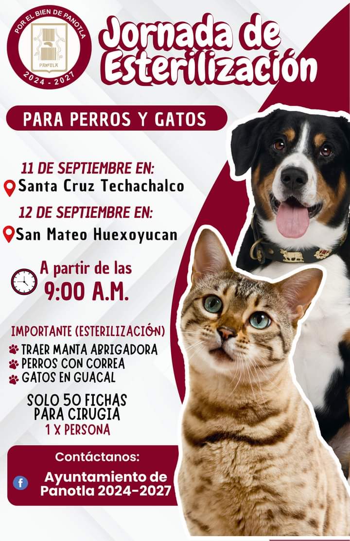 9 DE SEPTIEMBRE 2024 El Ayuntamiento de Panotla a través de la Secretaría de Salud (SESA) invitan a la campaña de esterilización. Dicha campaña se realizará el próximo miércoles 11 de septiembre en Santa Cruz Techachalco y el jueves 12 en San Mateo Huexotucan, a partir de la 9:00 horas, está jornada esta dirigida aSigue leyendo «El AYUNTAMIENTO DE PANOTLA EN COORDINACIÓN CON LA SESA REALIZARÁN CAMPAÑA DE ESTERILIZACIÓN»