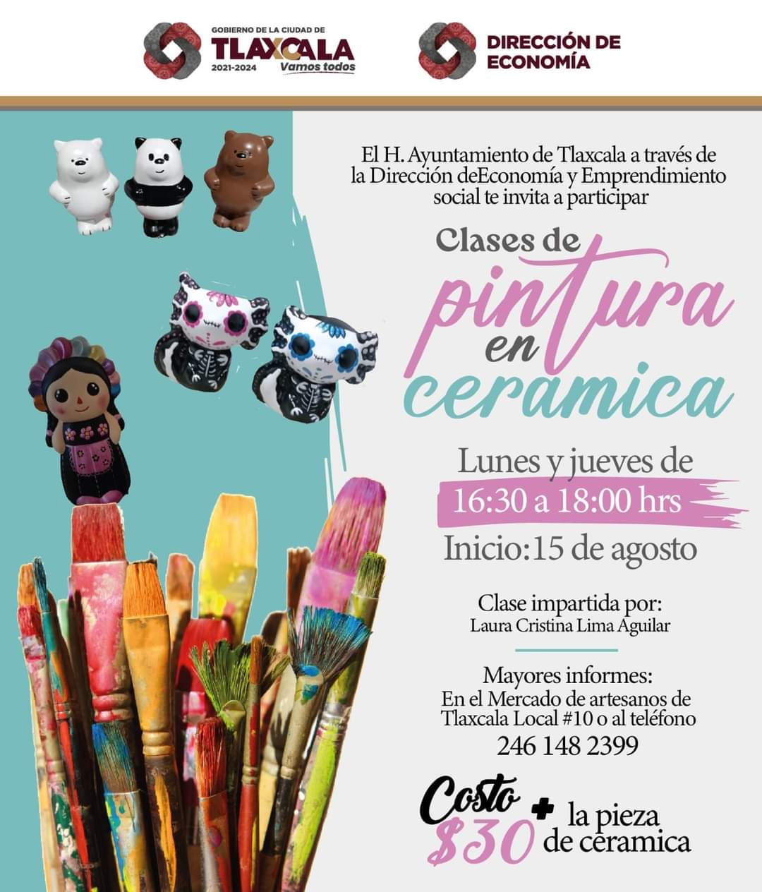 8 DE AGOSTO 2024 🏺El Ayuntamiento de Tlaxcala invita al público en general a participar en las clases de pintura en cerámica, actividad hecha para toda la familia. Iniciamos el 15 de agosto, en las instalaciones del Mercado de Artesanos Tlaxcala .¡No te lo pierdas! VamosTodos #Tlaxcala